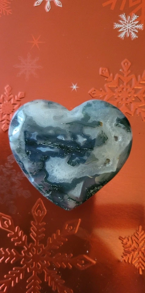 A beautiful moss agate heart! The stone has a lovely mix of green, grey and white. It's perfect for display or as a unique addition to your collection