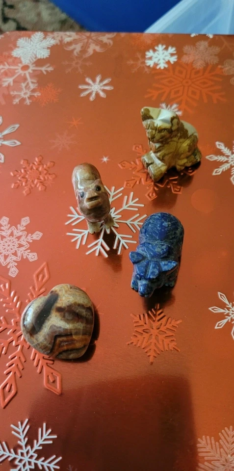 Here are four unique carved stone animal figurines. They include a bear, a pig, a hippo, and a heart-shaped stone. They would make a great addition to any collection or as decorative pieces around the house