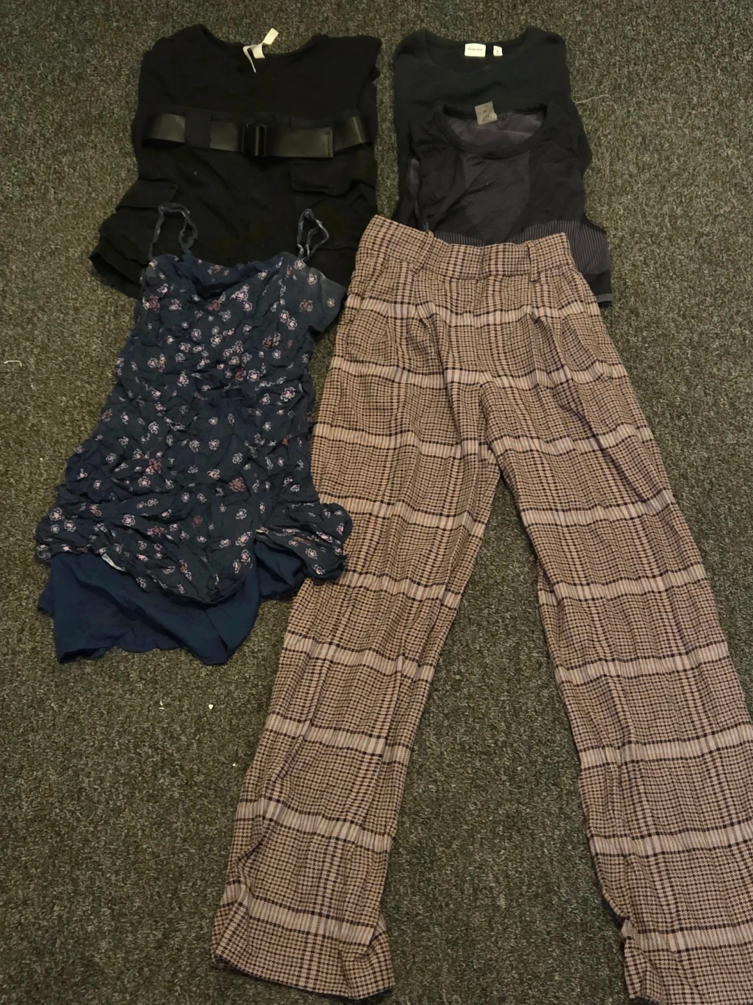 Selling a mixed lot of Sunday Best, Babaton, and Wilfred women's clothing. Includes a black shorts with belt, 2 black tops small and Medium, a blue floral Sunday Best dress, and a Wilfred plaid pants size 0, And a TNA black sports bra/ top size Medium. All in good condition!