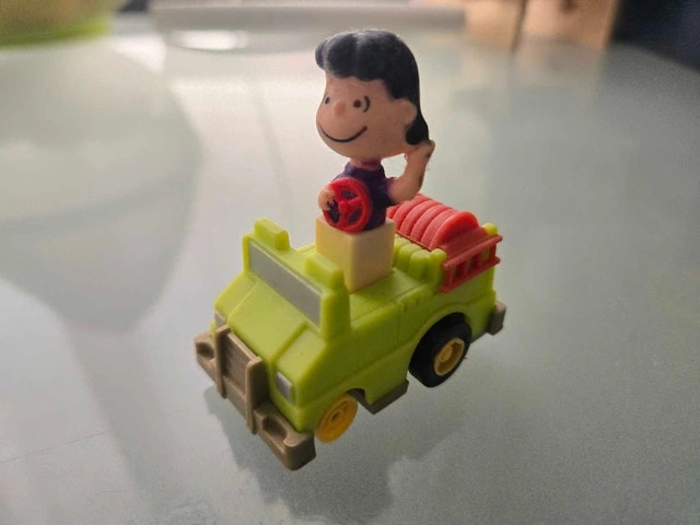 These are three vintage McDonald's Happy Meal toys from the Peanuts Gang collection. These used toys feature Charlie Brown as a train conductor, Lucy as a fire truck driver, and Woodstock in a race car.
