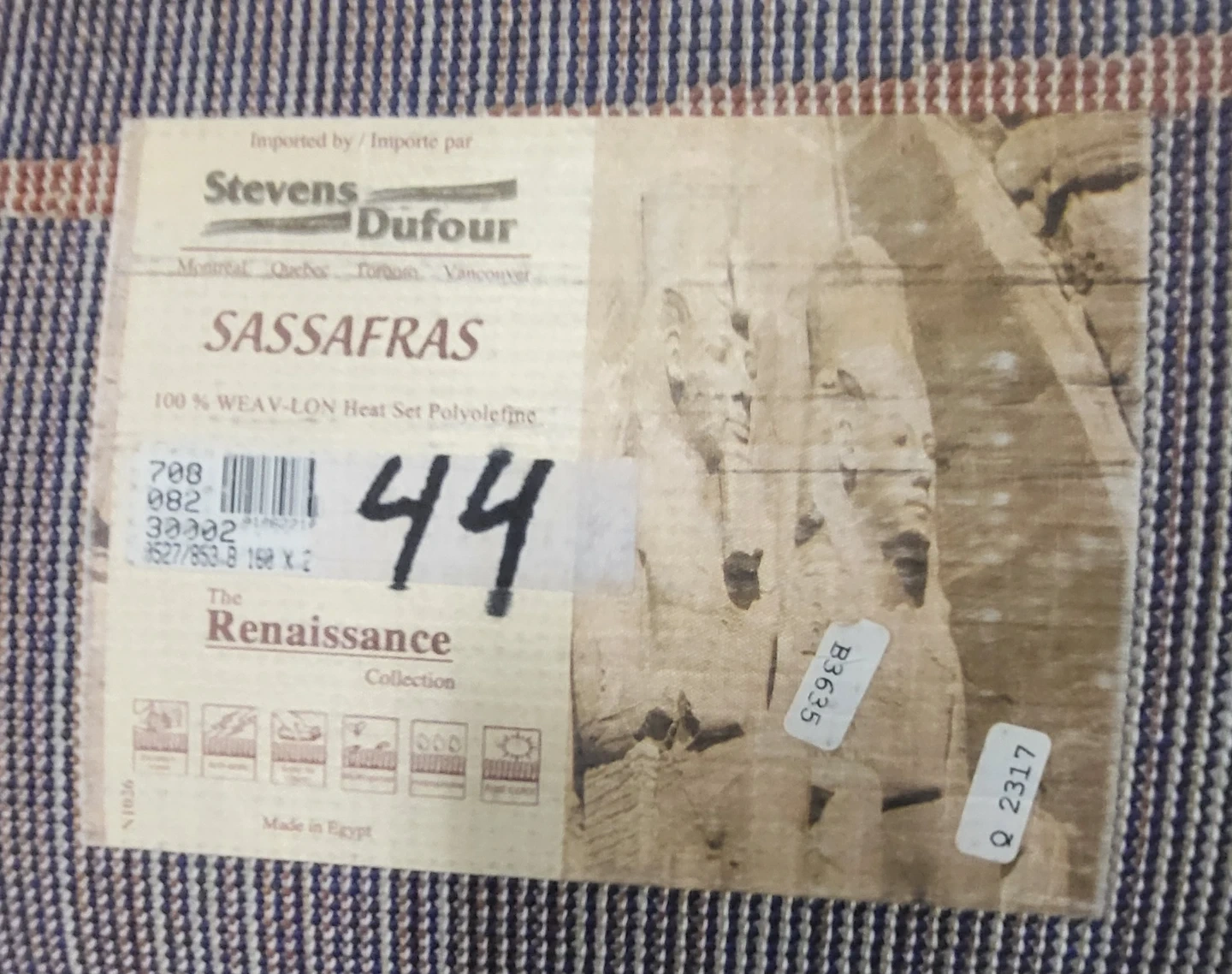 This is a Stevens Dufour rug from the Sassafras Renaissance Collection. It's a beautiful blue colour with orange detailing. It's made of 100% WEAV-LON Heat Set Polyefine.