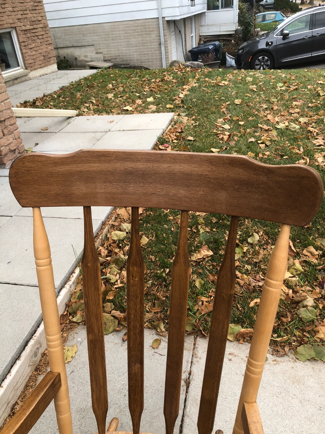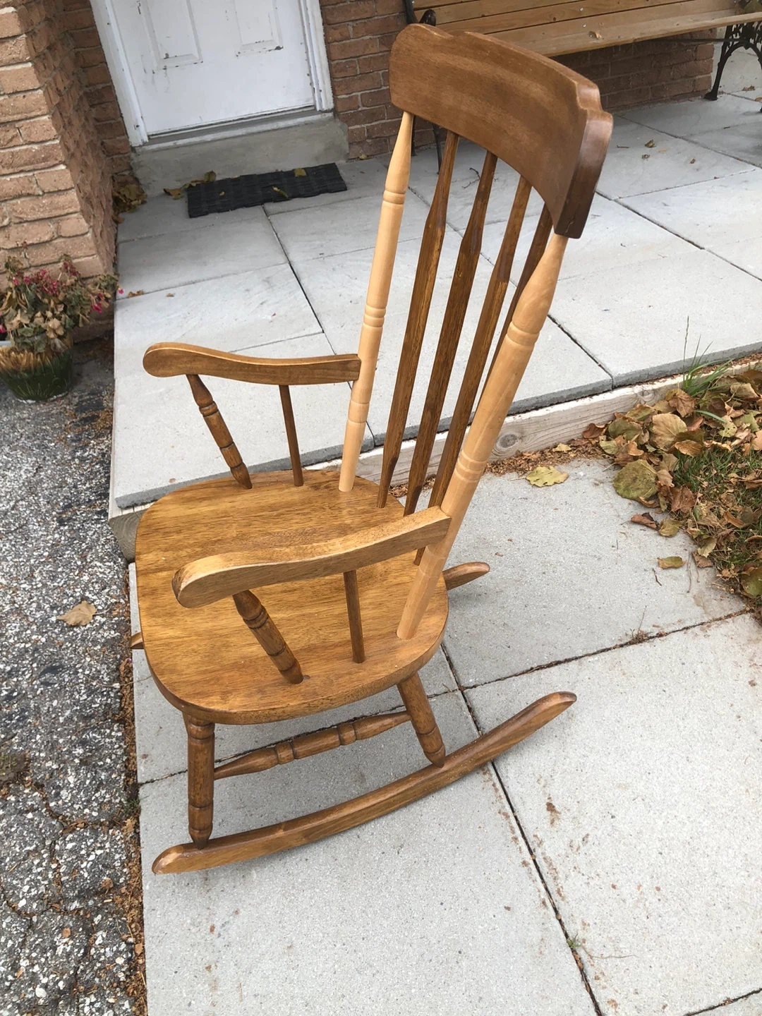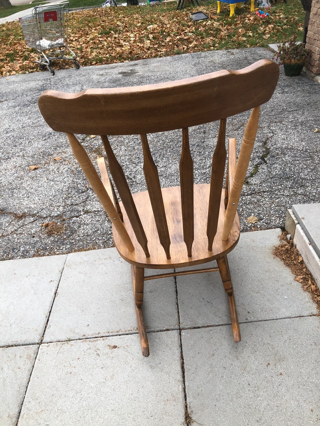 Selling a lovely wooden rocking chair! It's in great condition and would be a perfect addition to any home. The wood has a beautiful finish and the chair is very sturdy. It's ready for a new owner to enjoy!