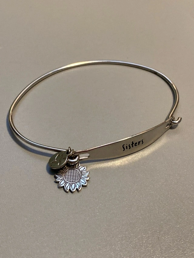 This is a Chamilia 'Sisters' bracelet with a sunflower and hummingbird charm. This bracelet is in good condition. Here are some additional details: