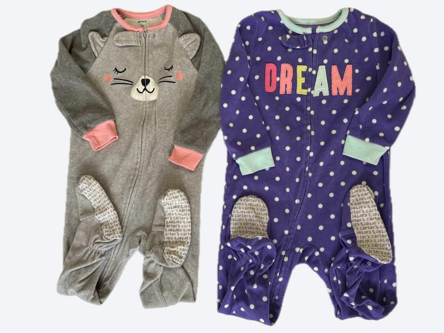 Two cozy Carter's footed pajamas in size 2T! One is a cute grey cat design, and the other is a purple polka dot with 'DREAM' on the front. Perfect for keeping your little one snug at night.