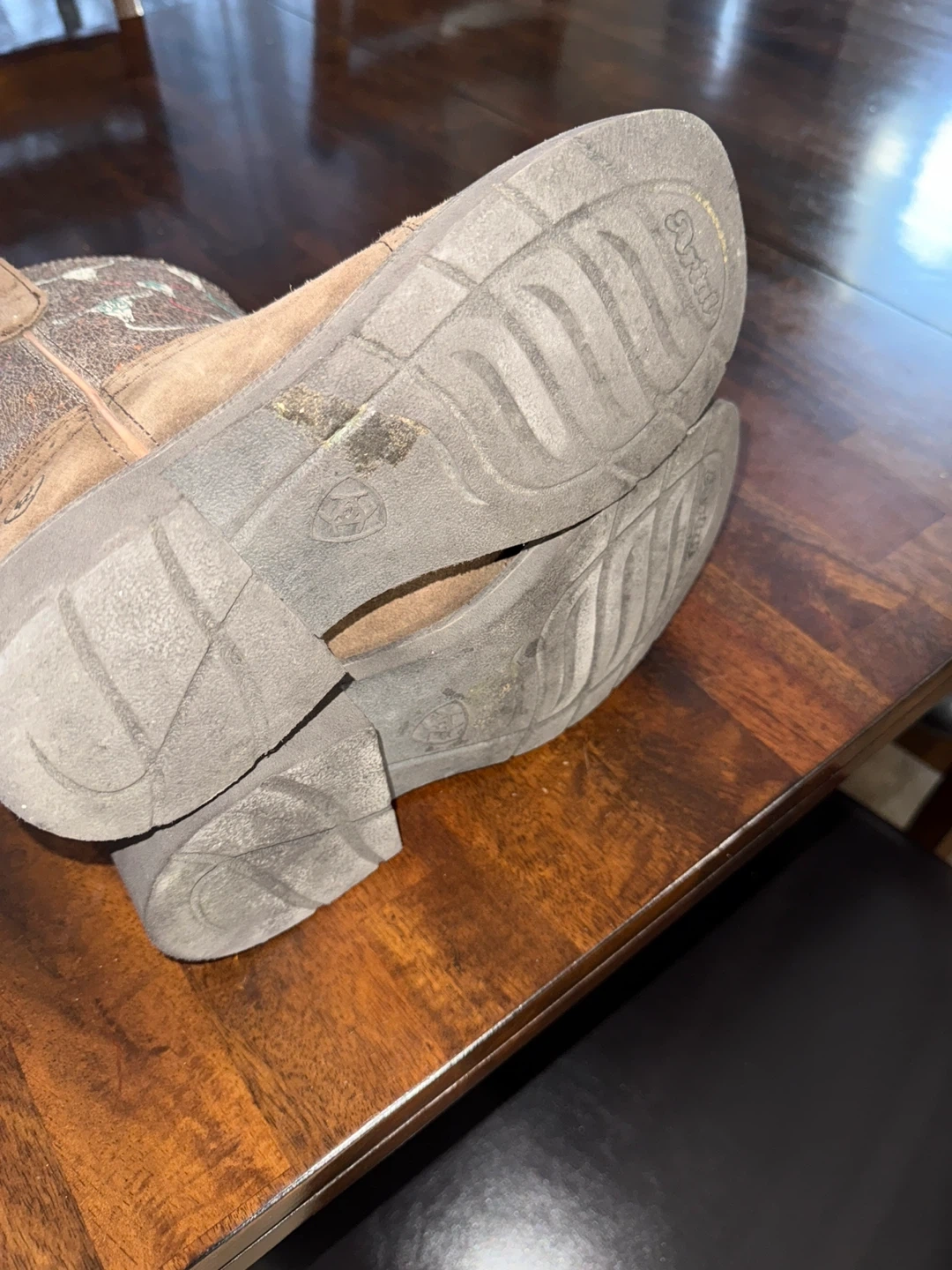 Selling a pair of Ariat kids' cowboy boots in size 7.5. They're in good condition and ready for a new home! The style number is 10053635. These boots are made with a leather upper and a balance of man-made materials