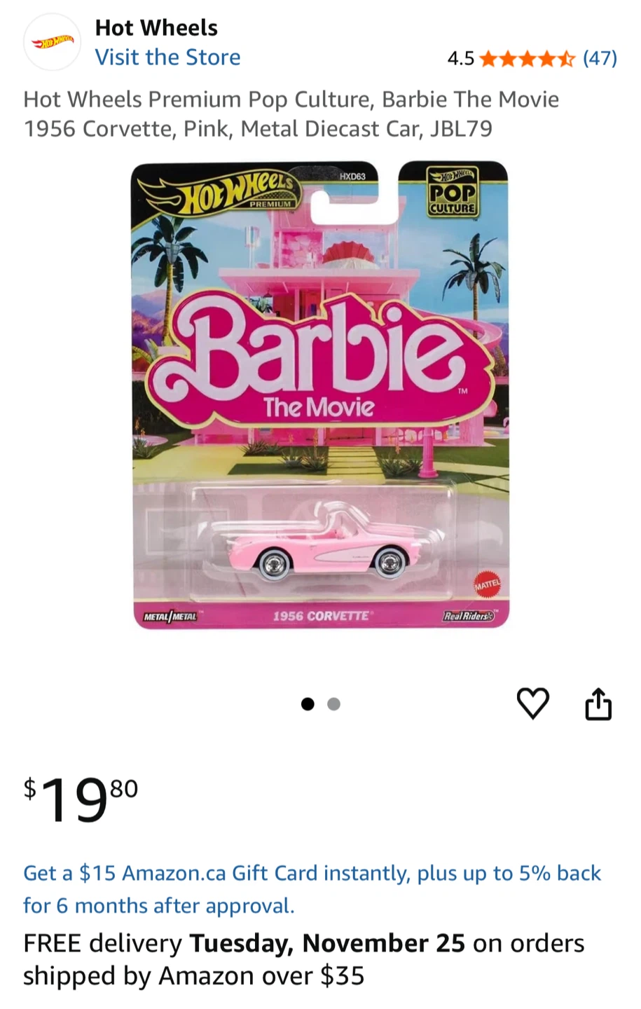 Selling a Hot Wheels Premium Pop Culture Barbie The Movie 1956 Corvette in pink!