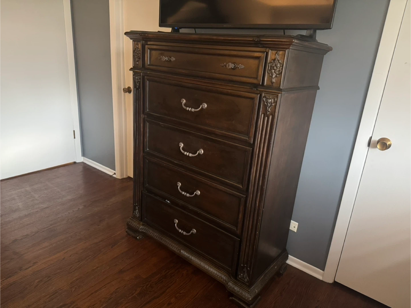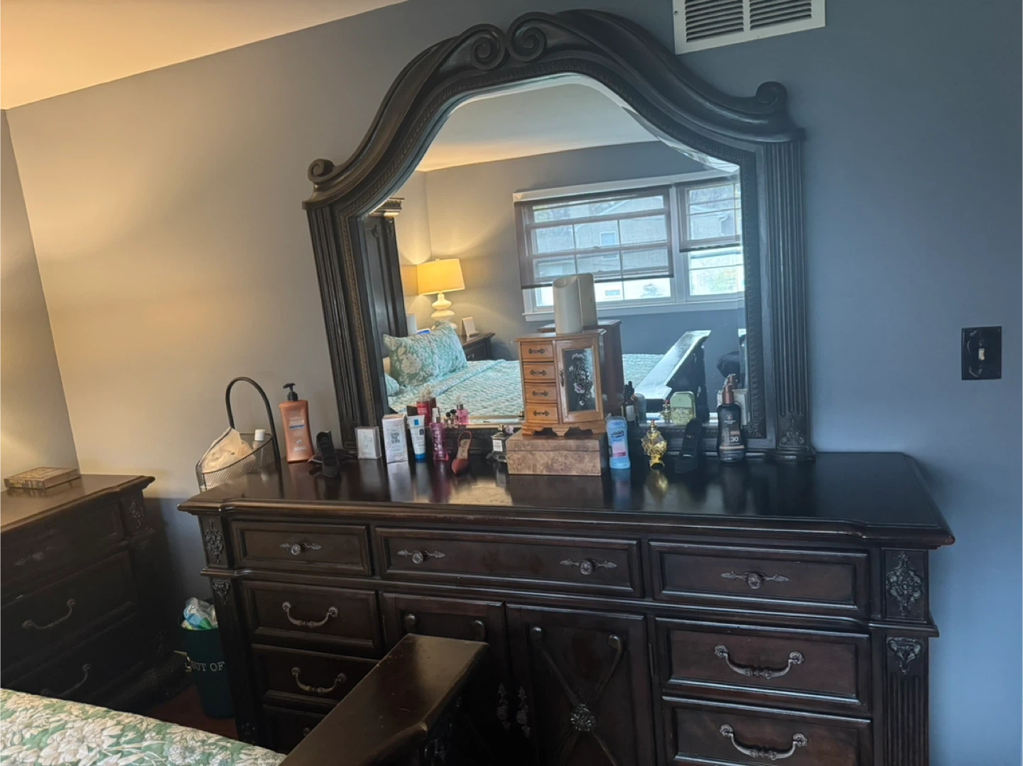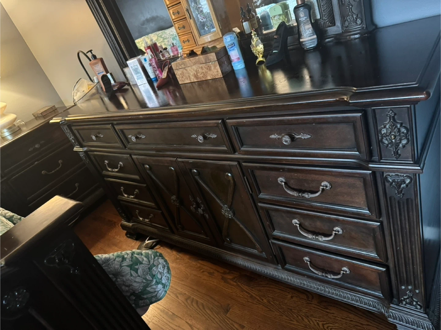- Includes: mirror, dresser with 9 drawers and two-door shelf, dresser with 5 drawers, and 2 night tables