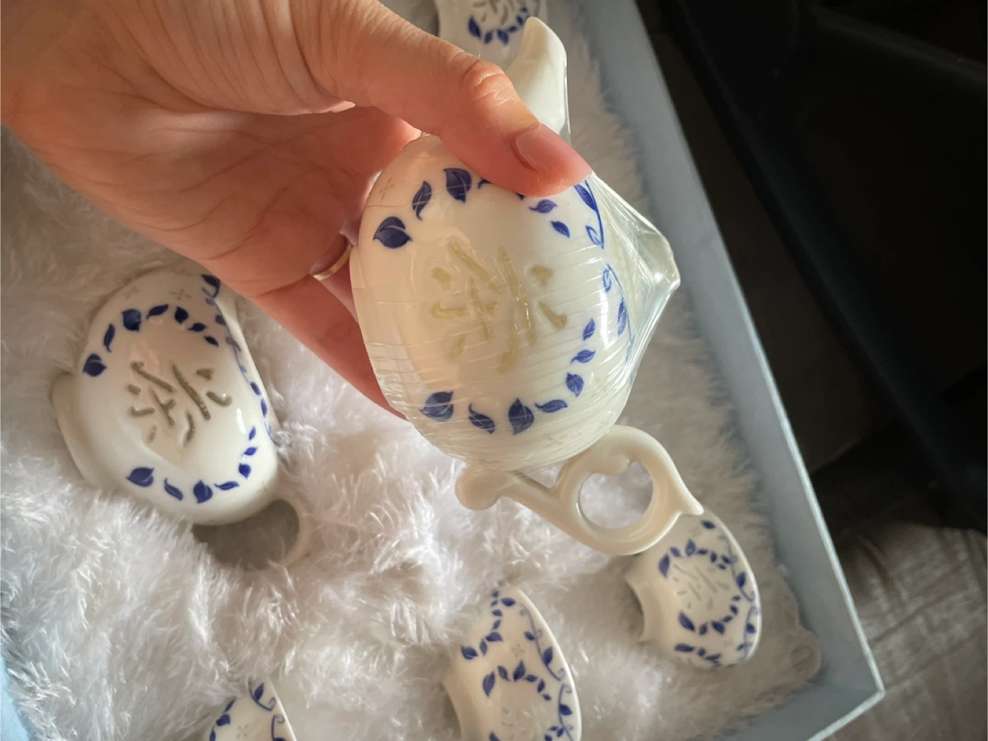 Selling a tea set that comes in a box. It has a delicate floral design in blue and white. The set appears to be in good condition and includes multiple cups and a teapot.