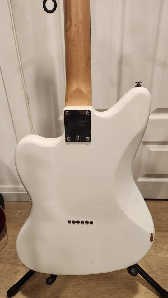 2017 Squier Affinity Series Jazzmaster HH in Arctic White with rosewood fingerboard. Features a Jazzmaster body, maple neck, two humbucker pickups, 3-way switch, master volume and tone controls, and a 6-saddle hardtail string-through bridge. Slim C-shaped neck and die-cast tuners.