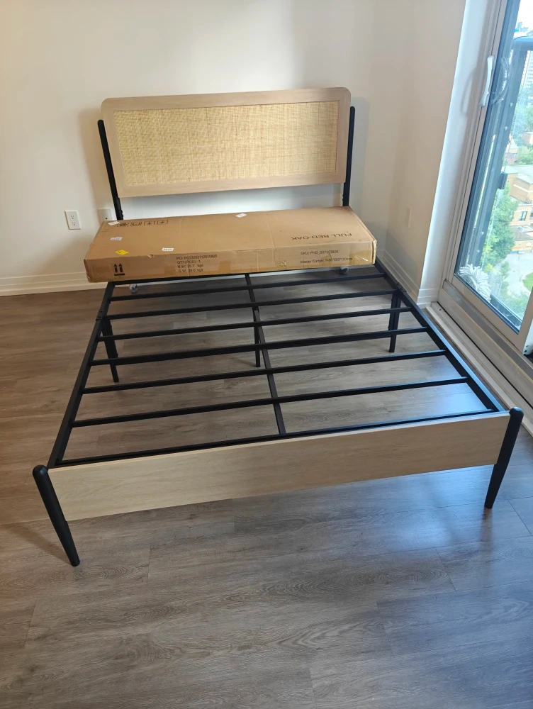 Selling a full size bed frame that features a stylish rattan headboard! It's a great addition to any bedroom. The frame is sturdy and can support up to 700lbs. It has a height of 43.3 inches, length of 78.5 inches and width of 55.4 inch.