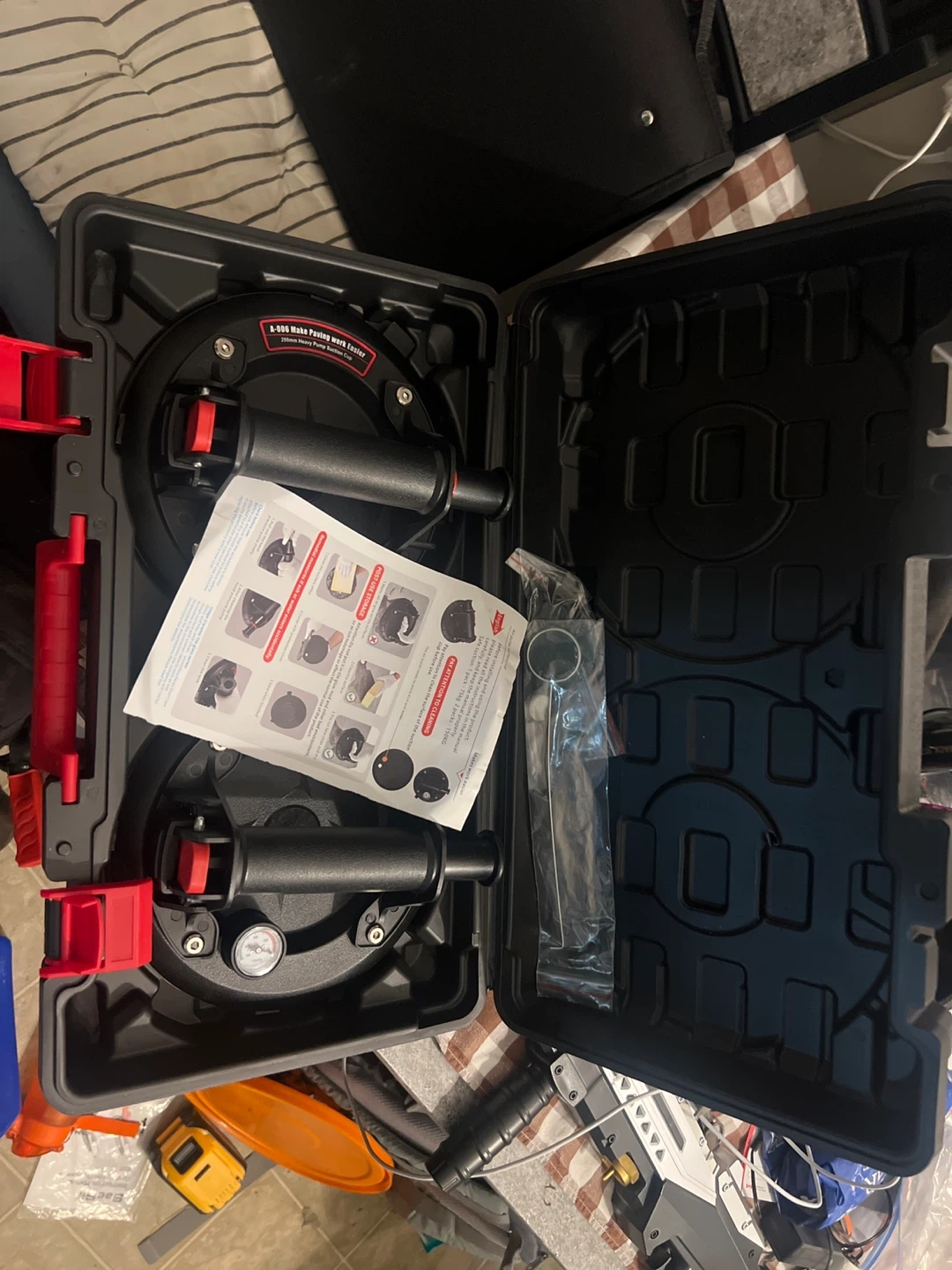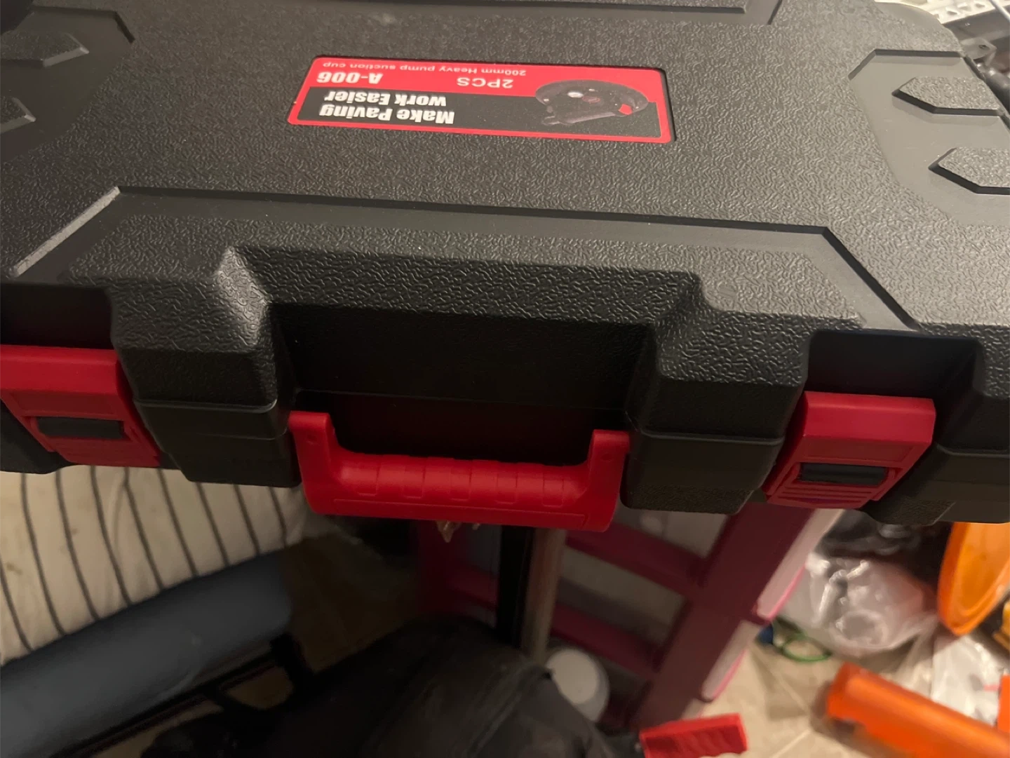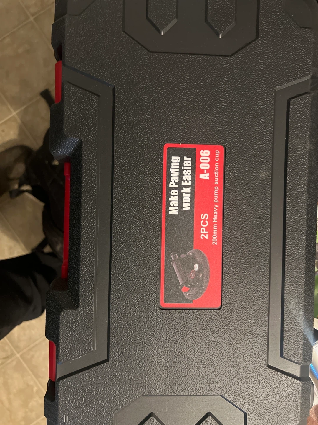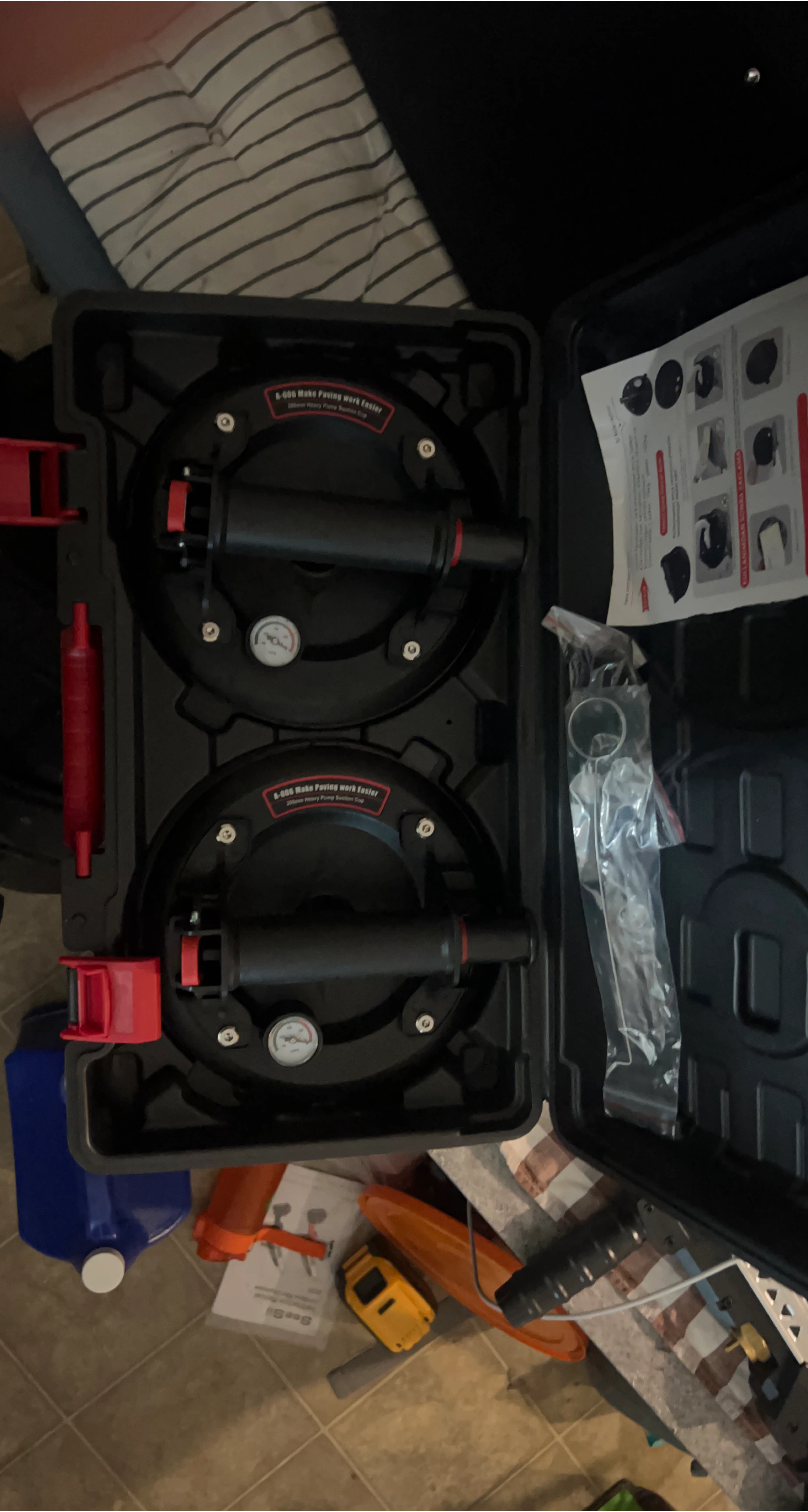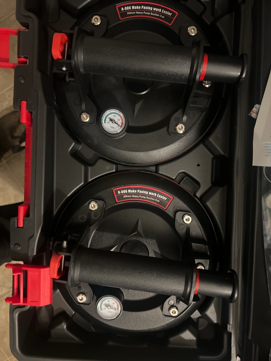 Selling a set of two heavy-duty pump suction cups, each 200mm in size. These are designed to make paving work easier and come in a case for convenient storage and transport. Perfect for anyone tackling tiling or paving projects!