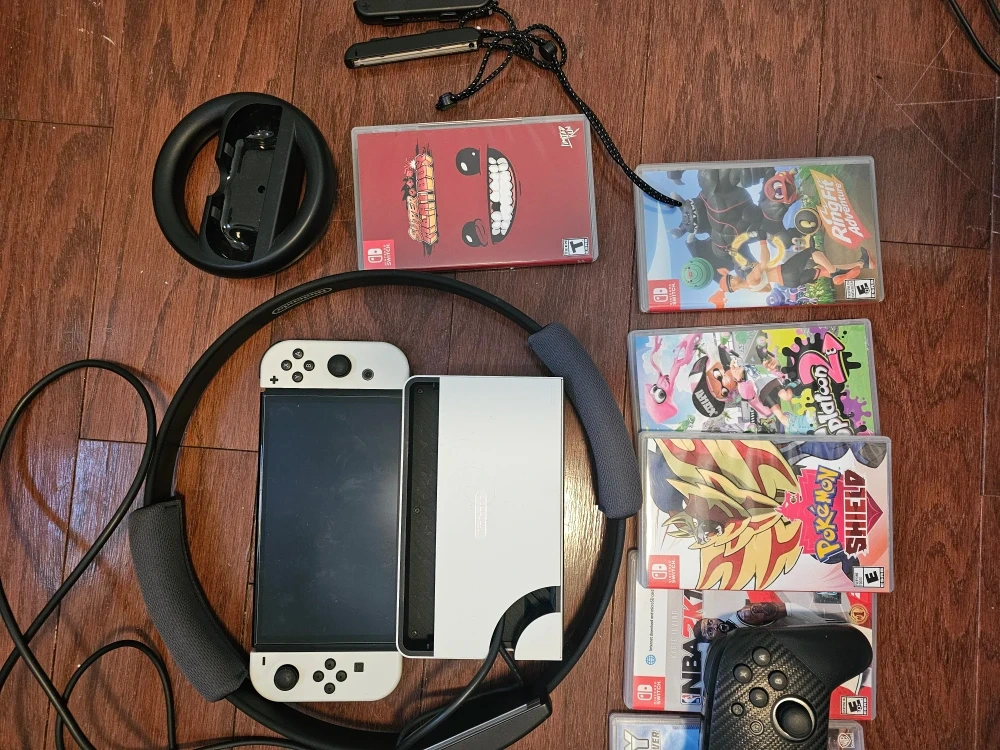 Selling a Nintendo Switch OLED model with several games and accessories! It includes the console, dock, joy-cons, and various games like Pokemon Shield, Splatoon 2, Also included are the Ring Fit Adventure game with the Ring-Con and a steering wheel for racing games. Great bundle for anyone looking to get into Nintendo Switch gaming!