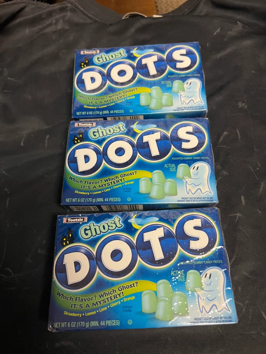 Selling three boxes of Tootsie Ghost DOTS gummy candy! Each box contains 6 oz (170 g) of assorted gummy candy pieces. Flavors include strawberry, lemon, lime, cherry, and orange. Get them while they're here!
