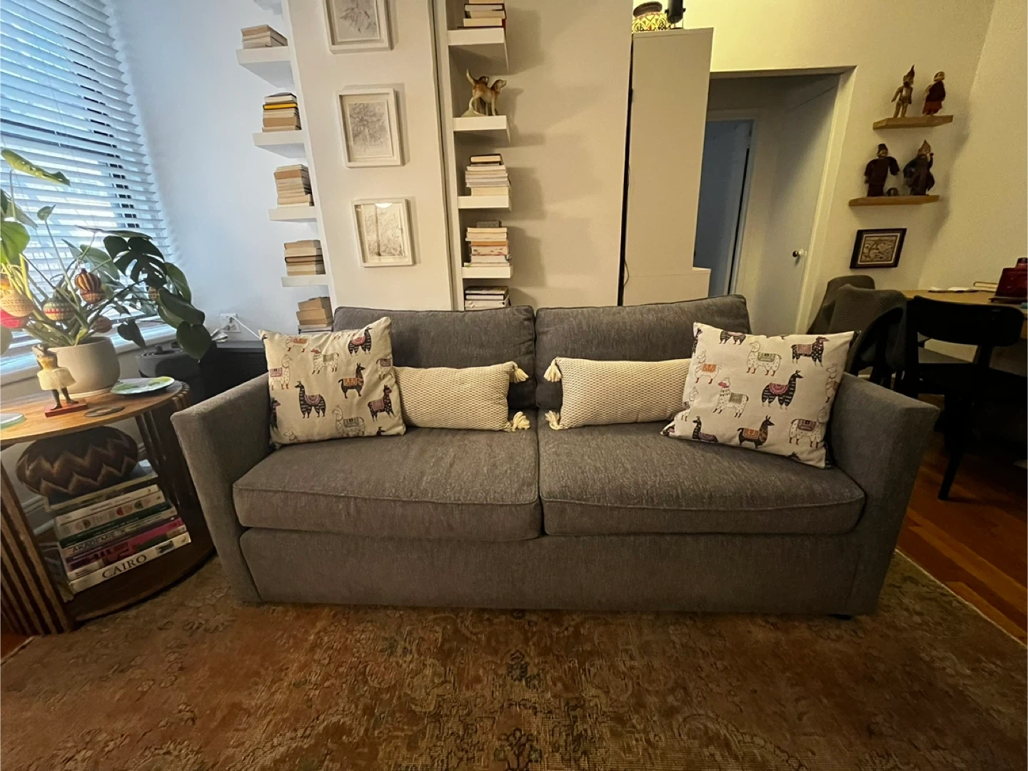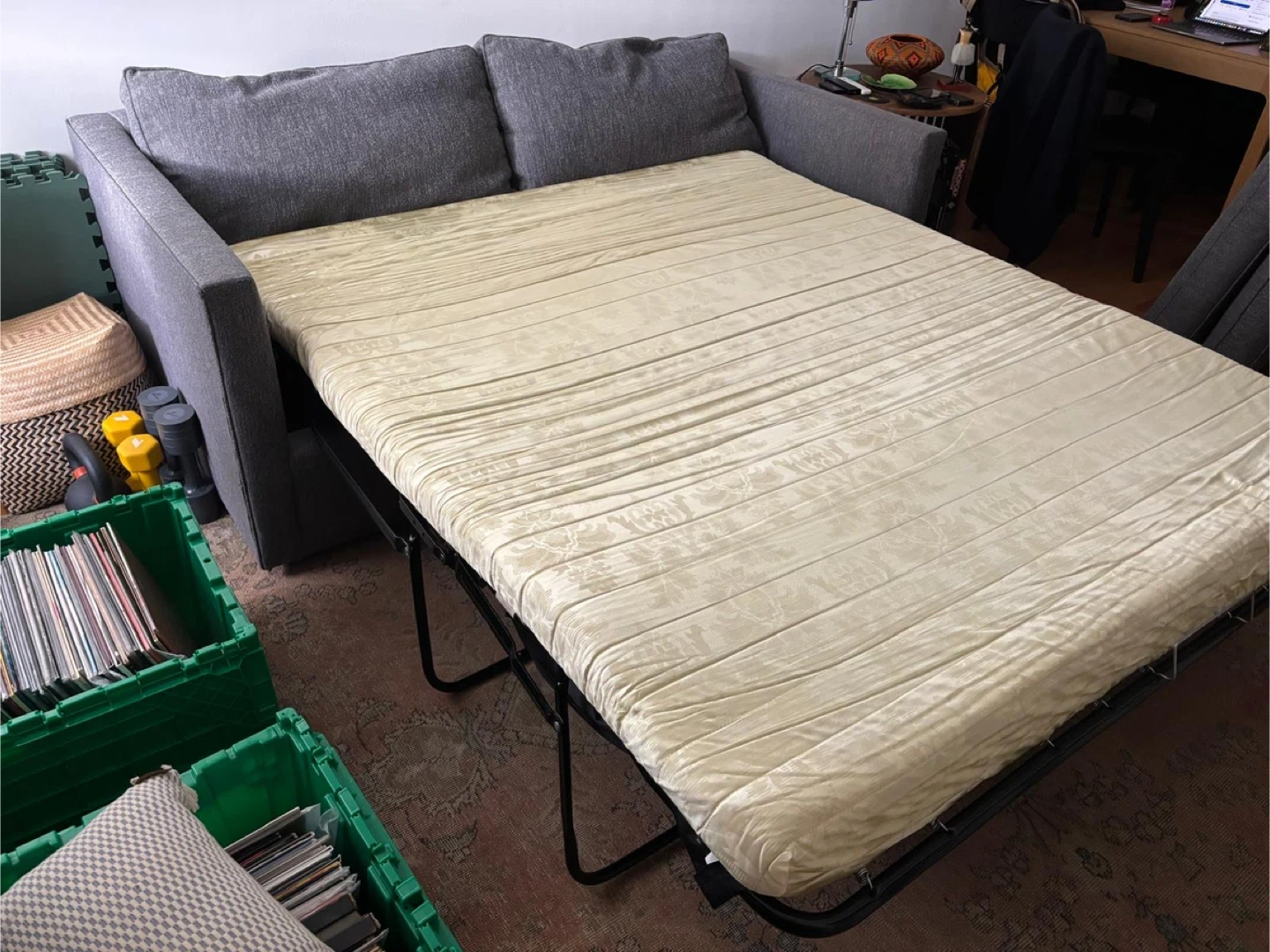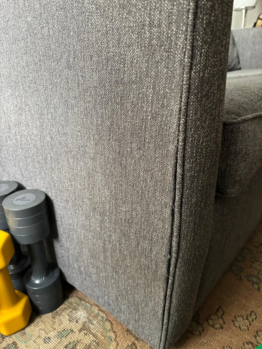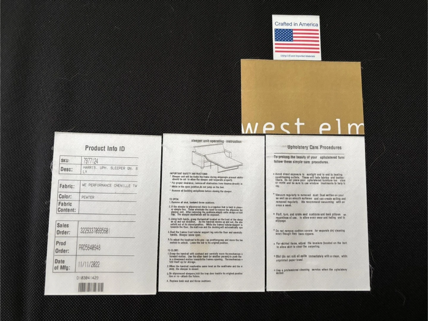 Selling a West Elm Harris Sleeper Sofa in queen size. The color is pewter. It's in good condition and ready for a new home! The date of manufacturing is 2022 November 11. The fabric content is chenille. One side of the welded structural metal bars under the bed fell off and we attached it back with a couple of heavy duty cable ties and we have not had any issues since then. Look for more detail in pictures