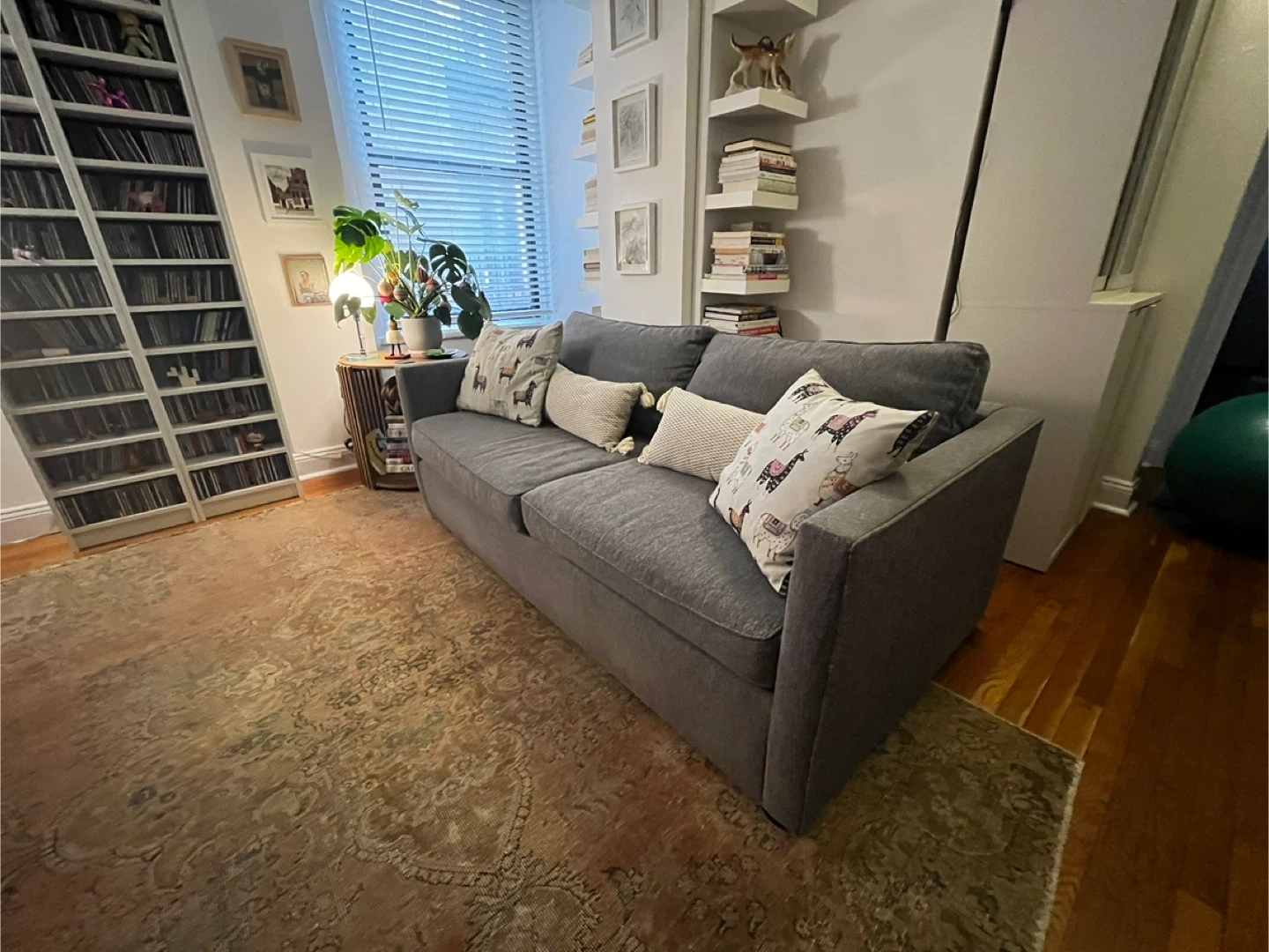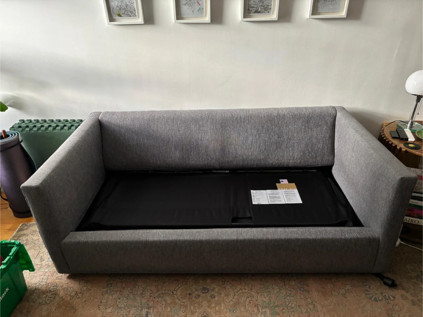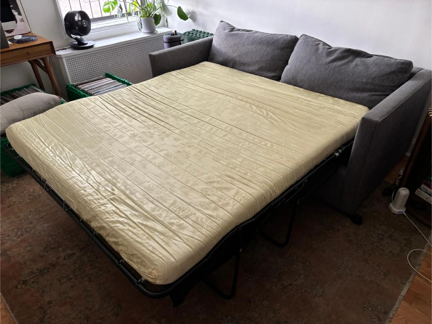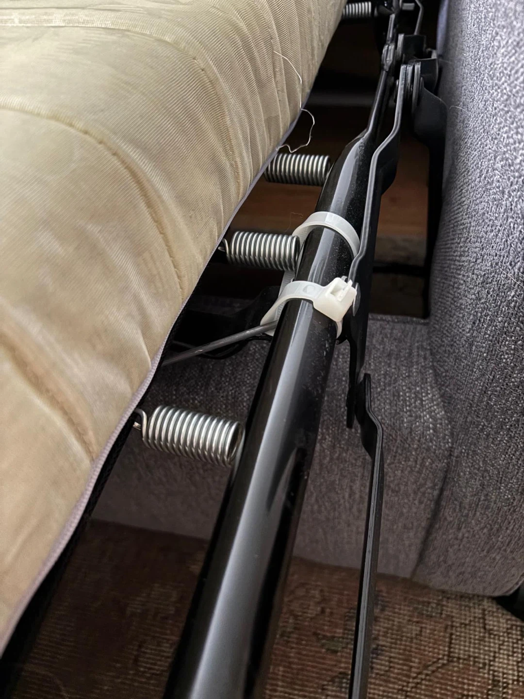 Selling a West Elm Harris Sleeper Sofa in queen size. The color is pewter. It's in good condition and ready for a new home! The date of manufacturing is 2022 November 11. The fabric content is chenille. One side of the welded structural metal bars under the bed fell off and we attached it back with a couple of heavy duty cable ties and we have not had any issues since then. Look for more detail in pictures