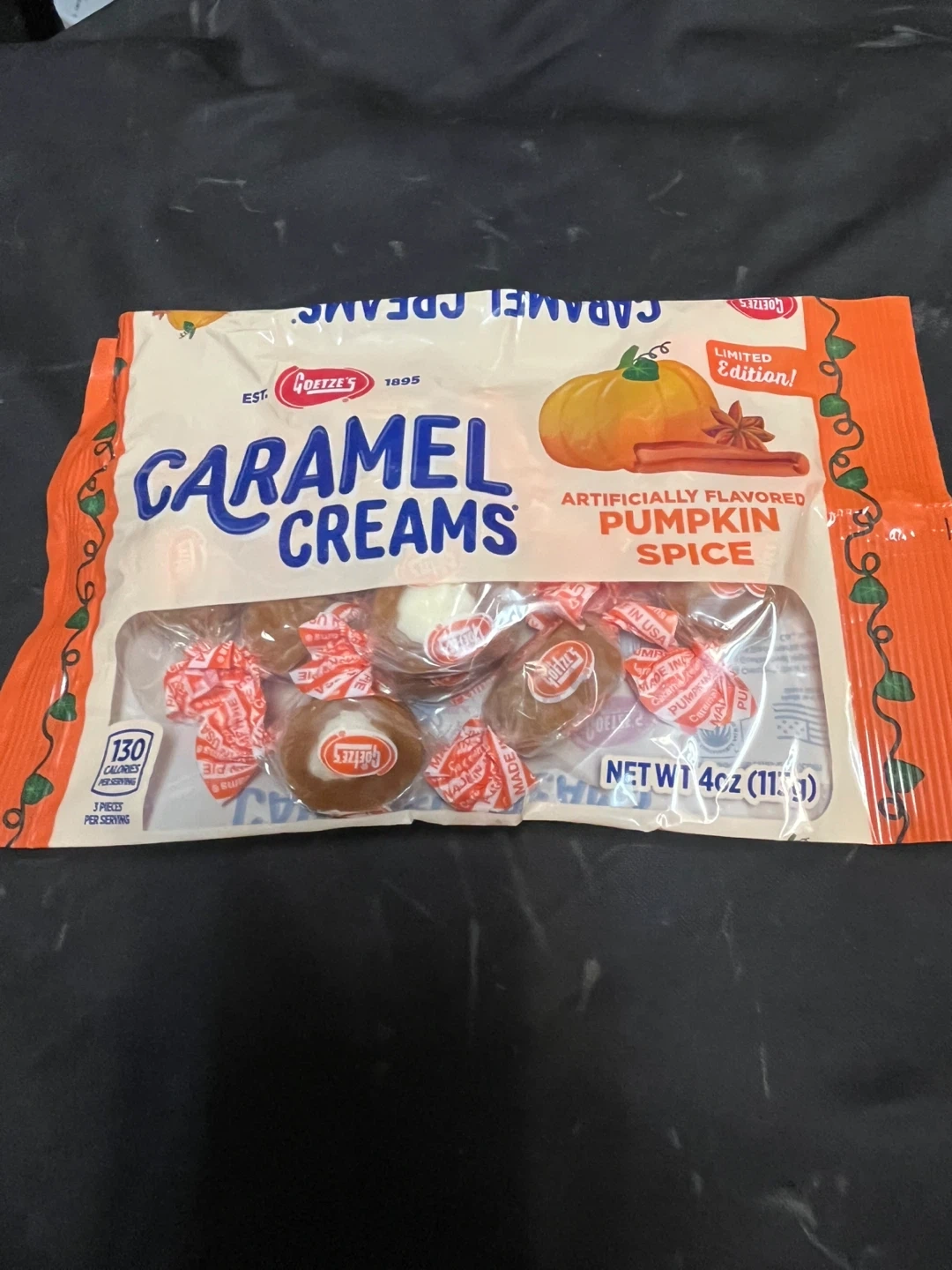 Here are Goetze's Caramel Creams in the limited edition Pumpkin Spice flavor! Each bag is 4oz (113g). These are artificially flavored and perfect for a fall treat!