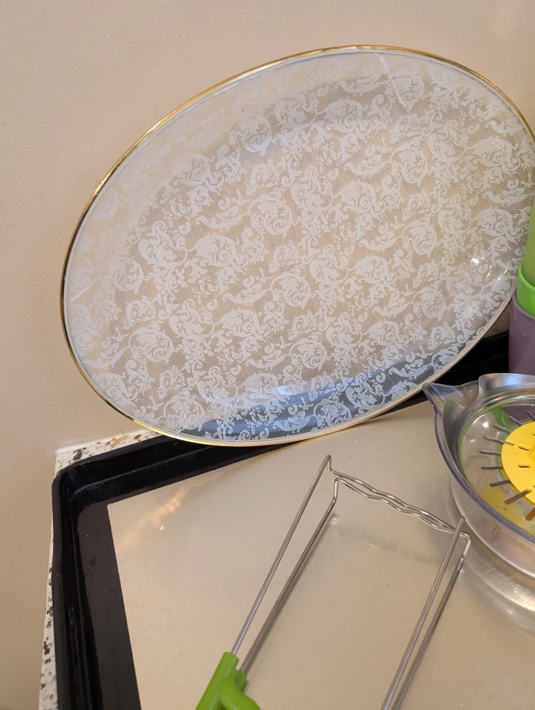 Selling a few kitchen items. There's a white expandable over the sink dish rack, 2 glass baking dishes, 2 trays, wooden cutting board, rectangular cake container with a lid, red and white collapsible colander, milk container etc. The price is for the whole bundle.