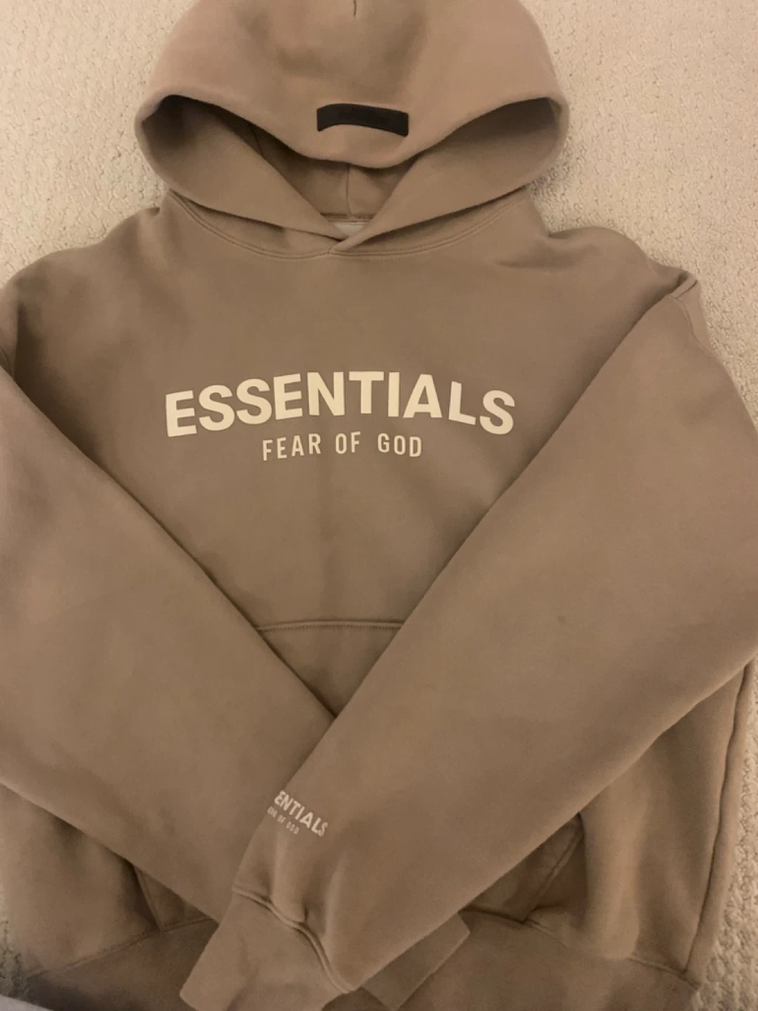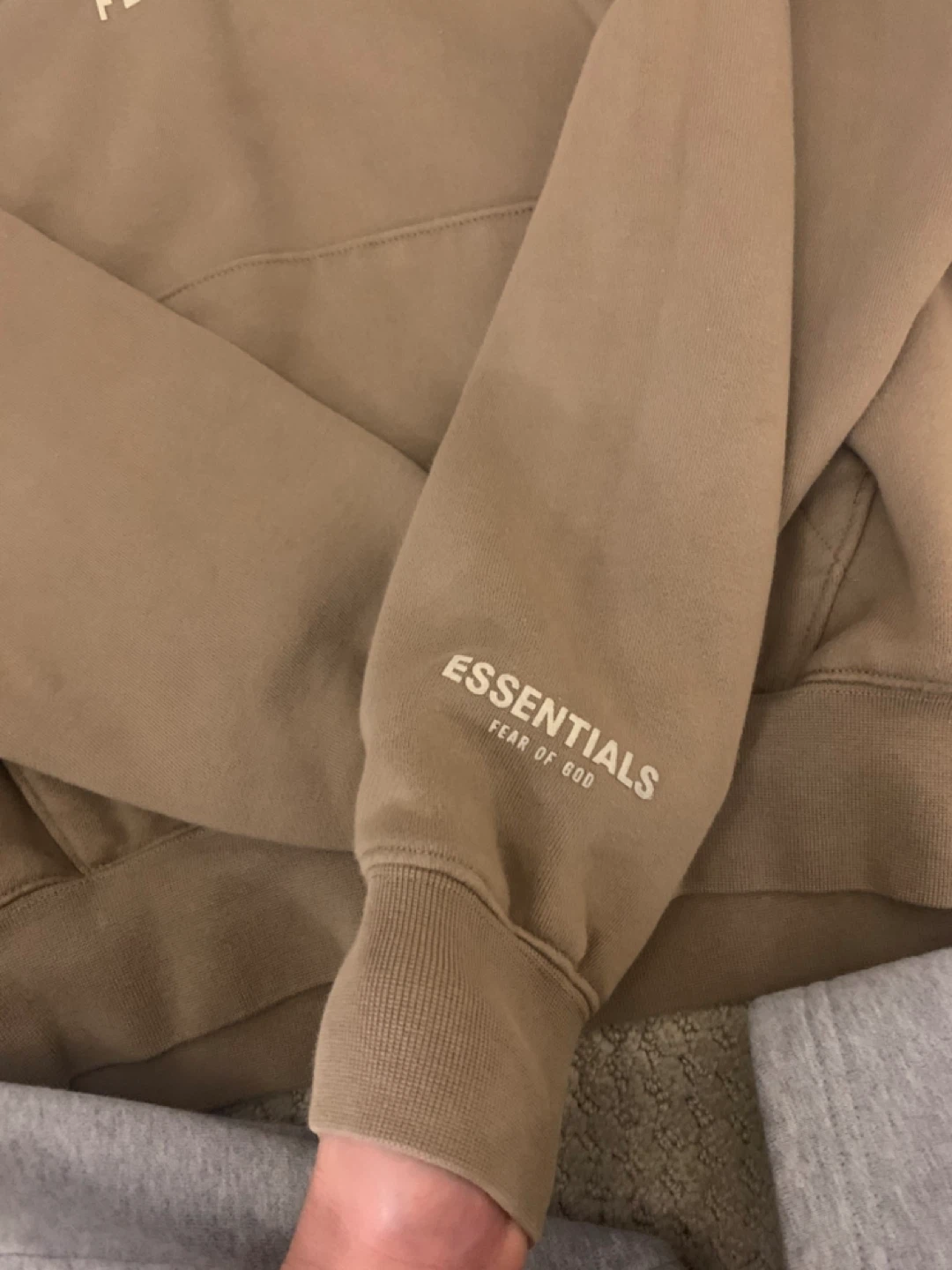 Selling an Essentials Fear of God hoodie in a neutral colour. It's in good condition and has the brand name printed on the front and sleeve. Perfect for a casual, comfy look!