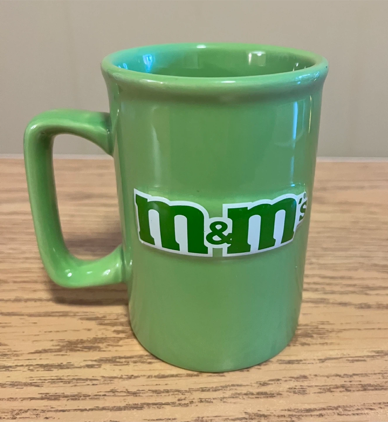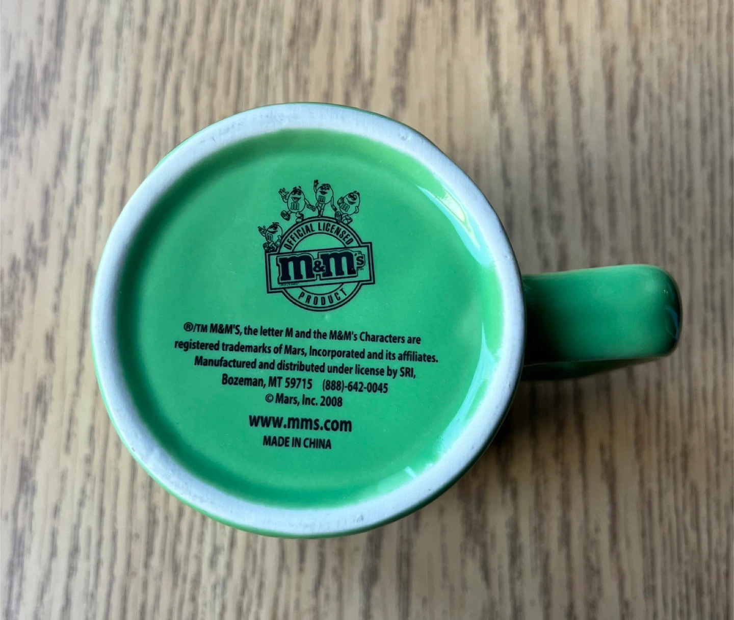 Here's a fun M&M's mug featuring the green M&M character! It's in great shape and ready for your morning coffee or hot chocolate. The mug is green and has the M&M's logo on it. It's an officially licensed product of Mars, Inc. from 2008