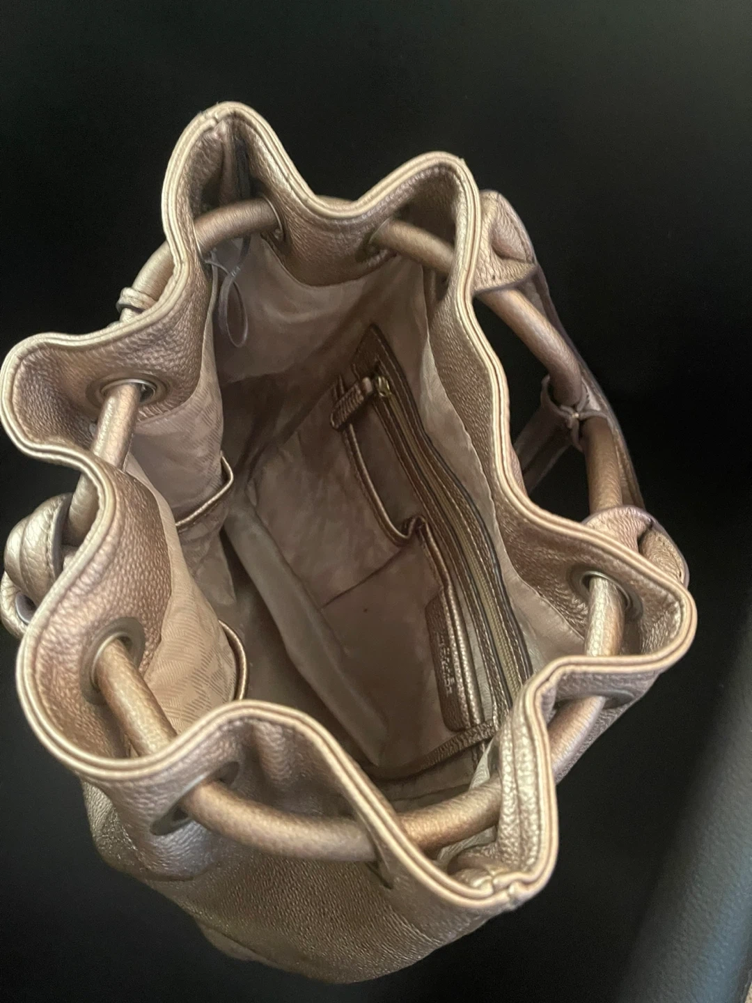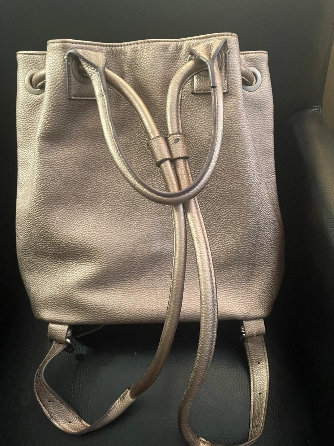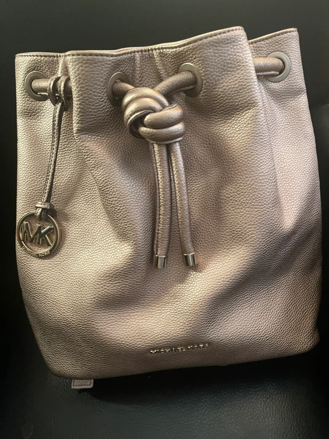 This is a stylish metallic bucket backpack from Michael Kors! It's in great condition and ready for a new home. Perfect for carrying your essentials in style