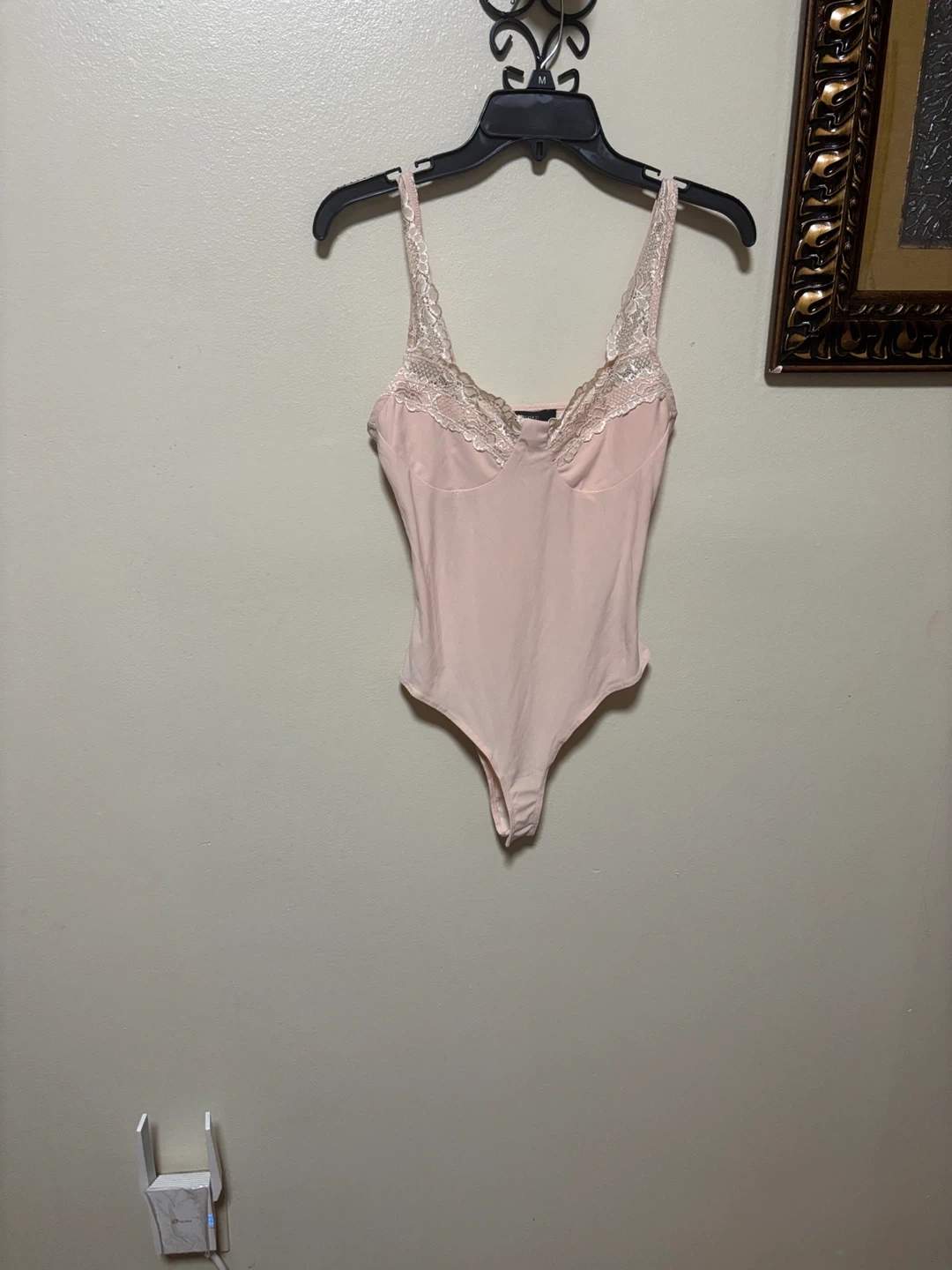 Selling a cute Forever 21 bodysuit in a lovely light pink color! It features delicate lace detailing around the neckline. Size is S.