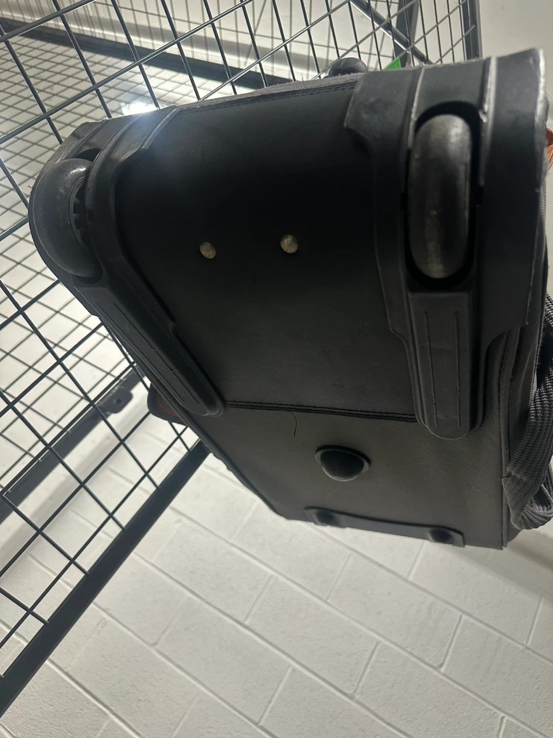 Rolling carry-on bag with a grey and orange colour scheme. It has a shoulder strap and multiple compartments for easy organization. Perfect for travel!
