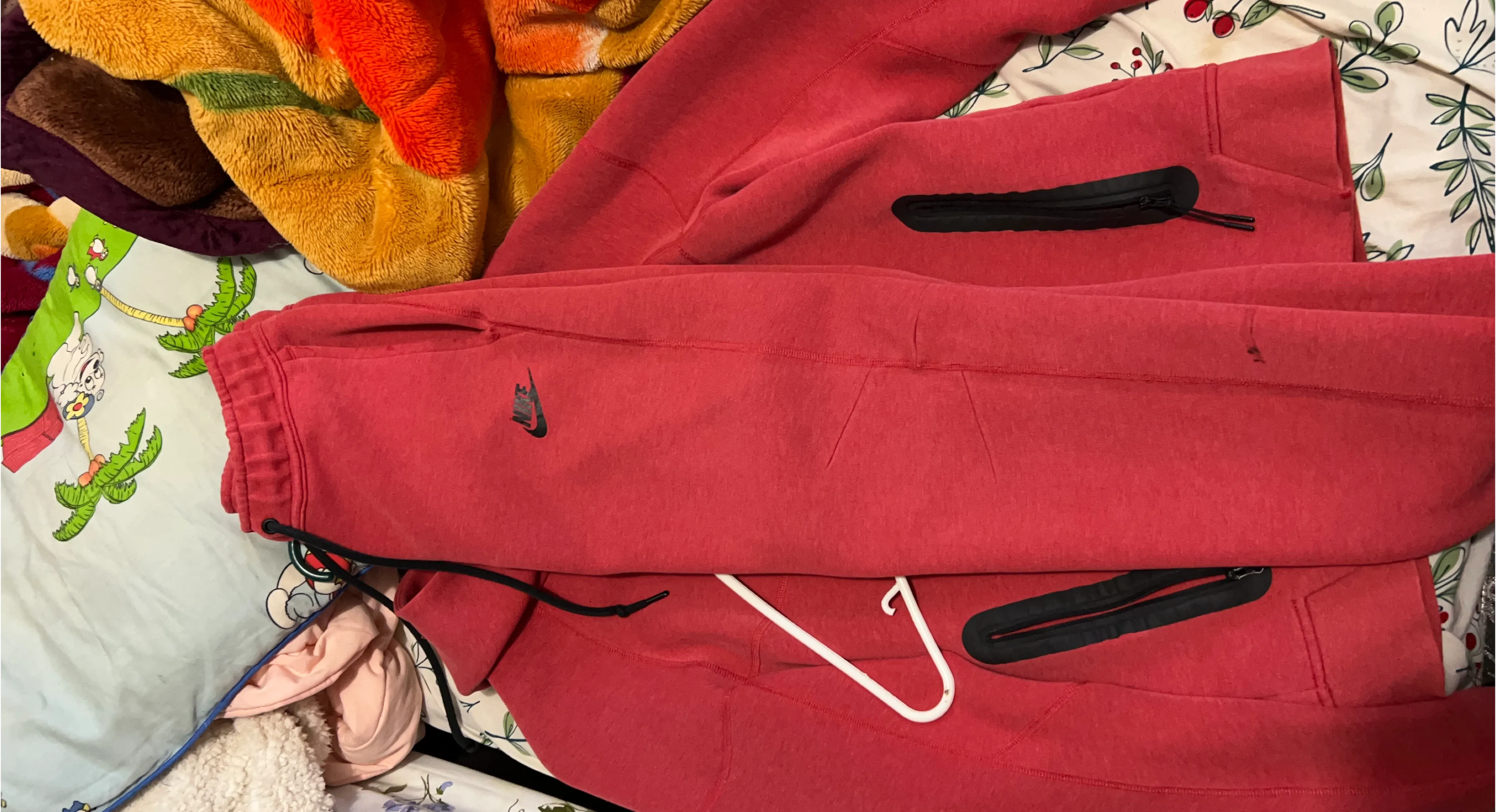 Selling a pair of Nike Tech Fleece joggers in red. They have a few signs of wear, as pictured, but are still in good condition for everyday wear. These are super comfy and stylish!