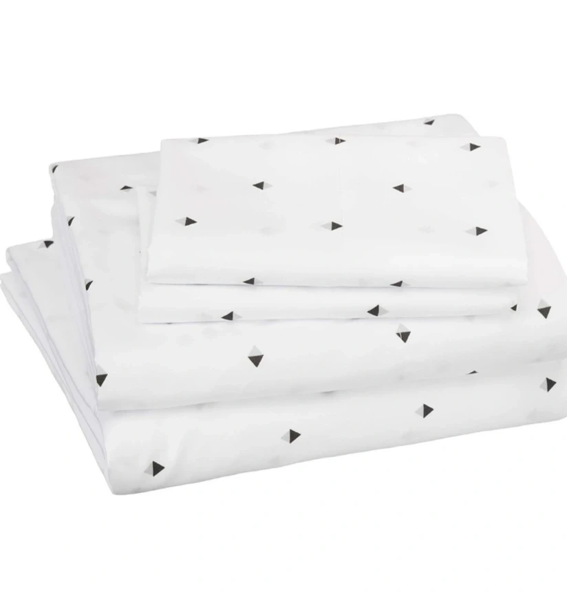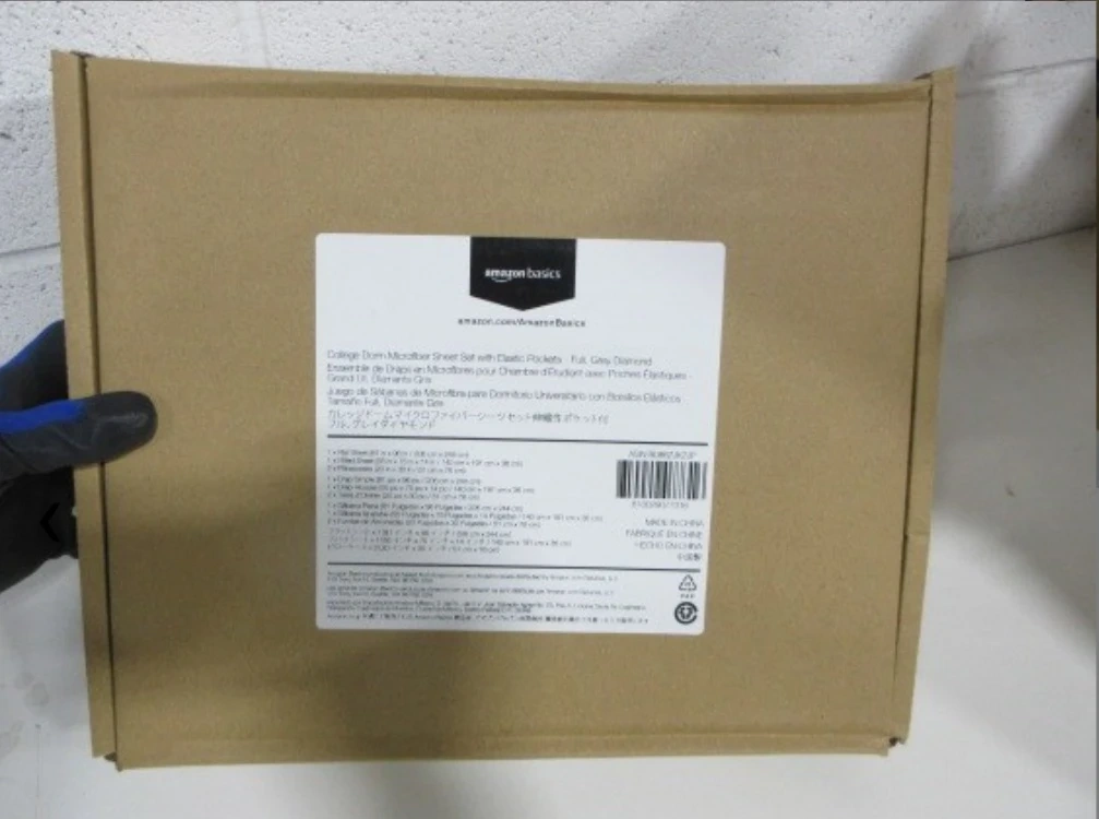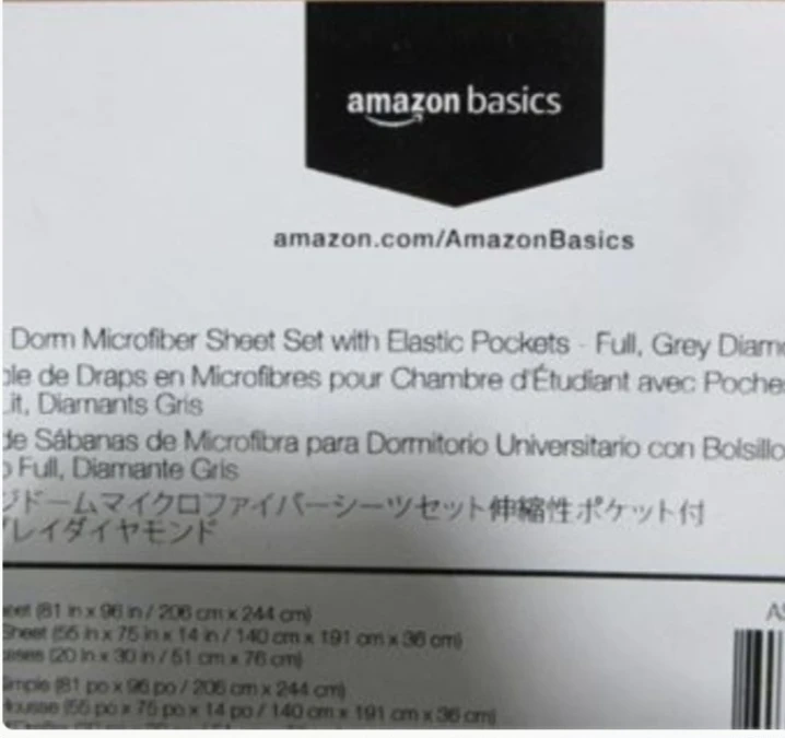 This is a full-size dorm microfiber sheet set from Amazon Basics. It features elastic pockets and a grey diamond pattern. The set includes everything you need to outfit a dorm bed! Comes in the original box
