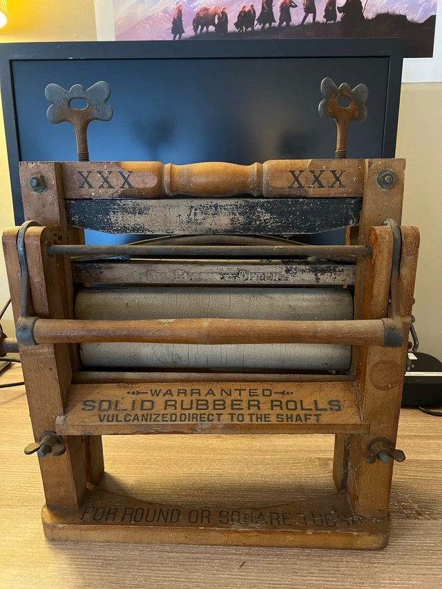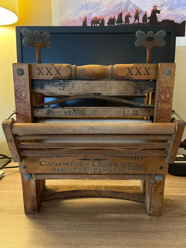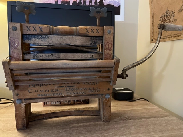Here is a vintage Cummer-Dowswell Improved Wringer Wash Board from Hamilton, Canada. This antique piece features solid rubber rolls and a sturdy construction designed for round or square tubs. A beautiful piece of Canadian history, it shows signs of wear consistent with its age and use. It's a unique find for collectors or those looking to add a touch of history to your home. Perfect for adding some flare to your laundry room. If the ad is up, the item is available!