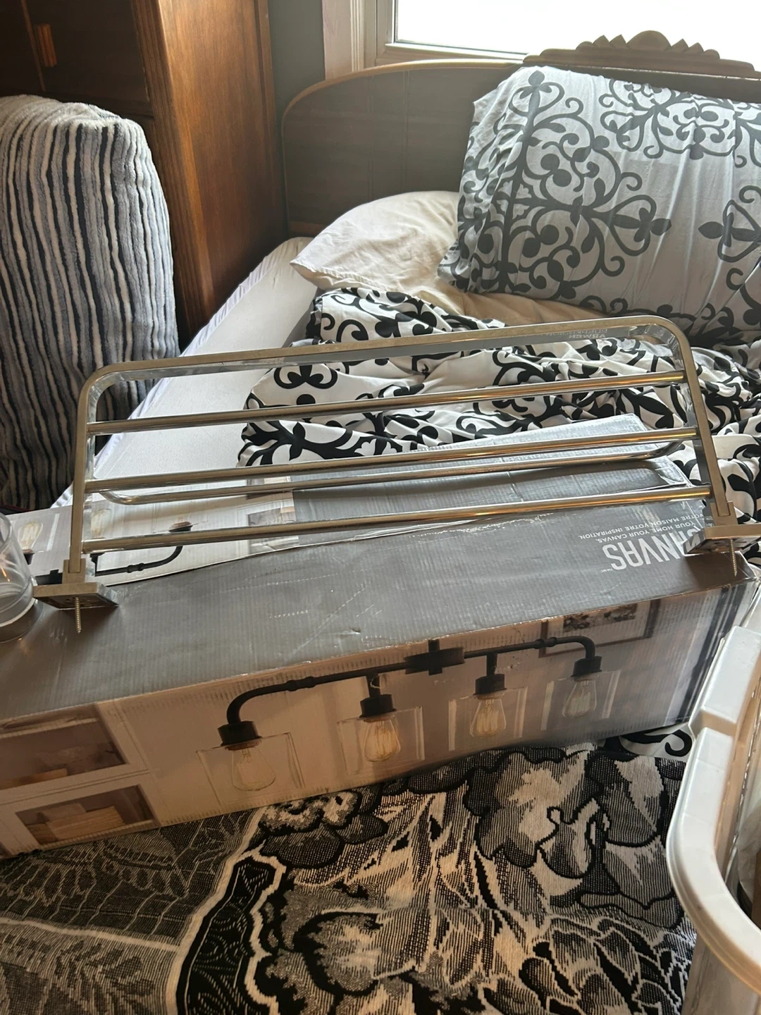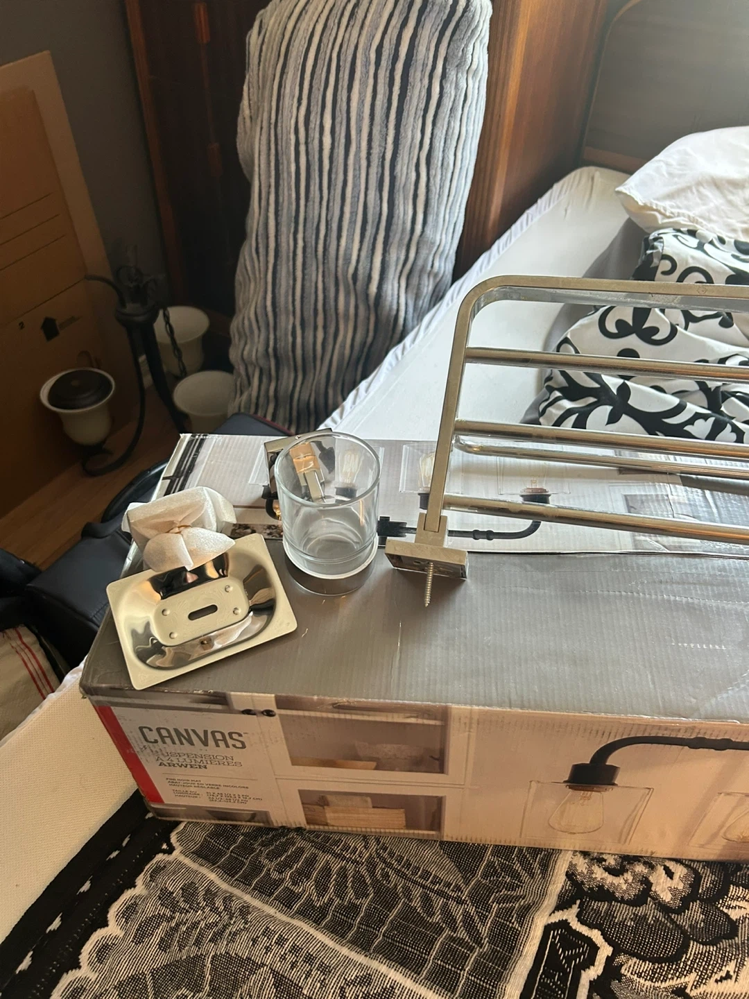 Selling a Canvas bathroom accessories set. It looks like it includes a towel rack, soap dish, and a glass holder. Great for adding a touch of style to your bathroom!