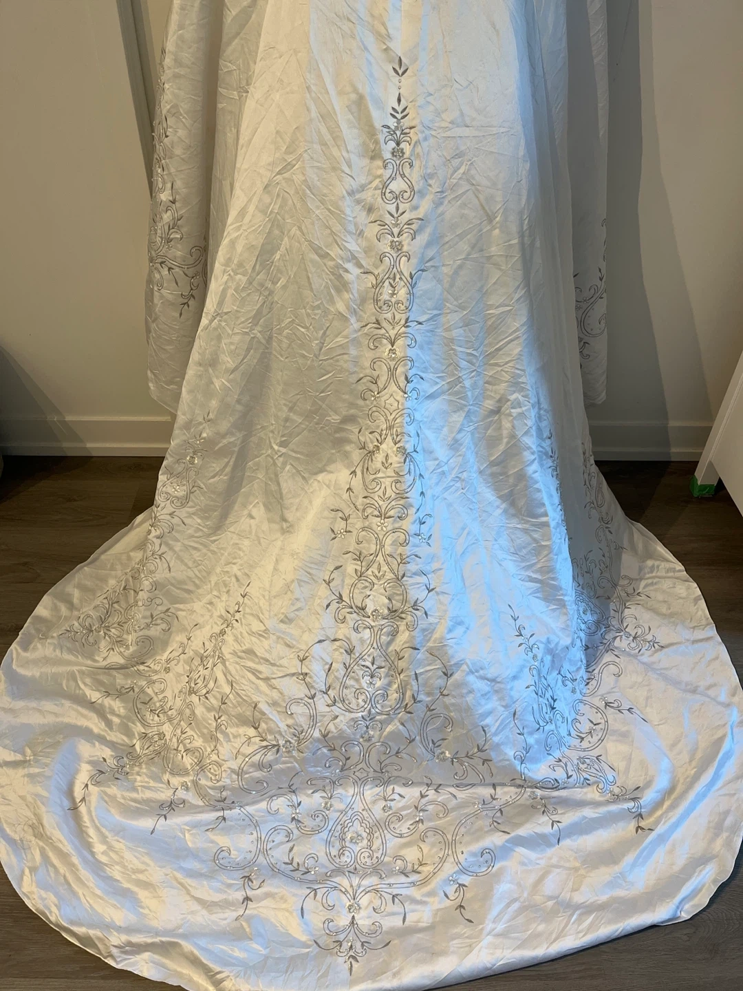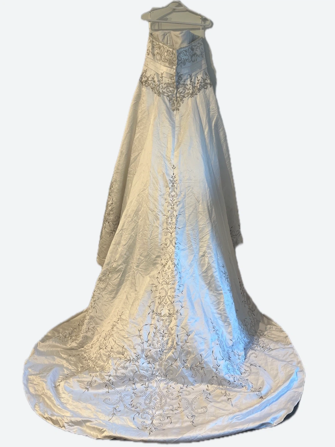 Beautiful white wedding dress featuring delicate silver embroidery. It's in great condition and ready for its next special day!