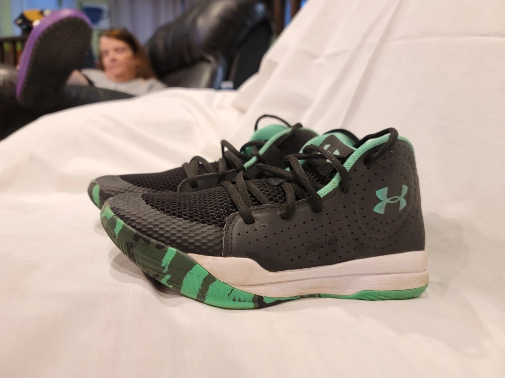 Selling a pair of Under Armour kids' basketball shoes in size 6. They are black with green accents and in good condition. Perfect for your little athlete!