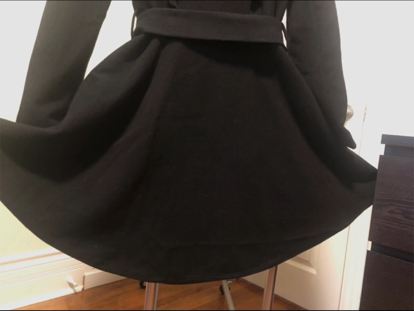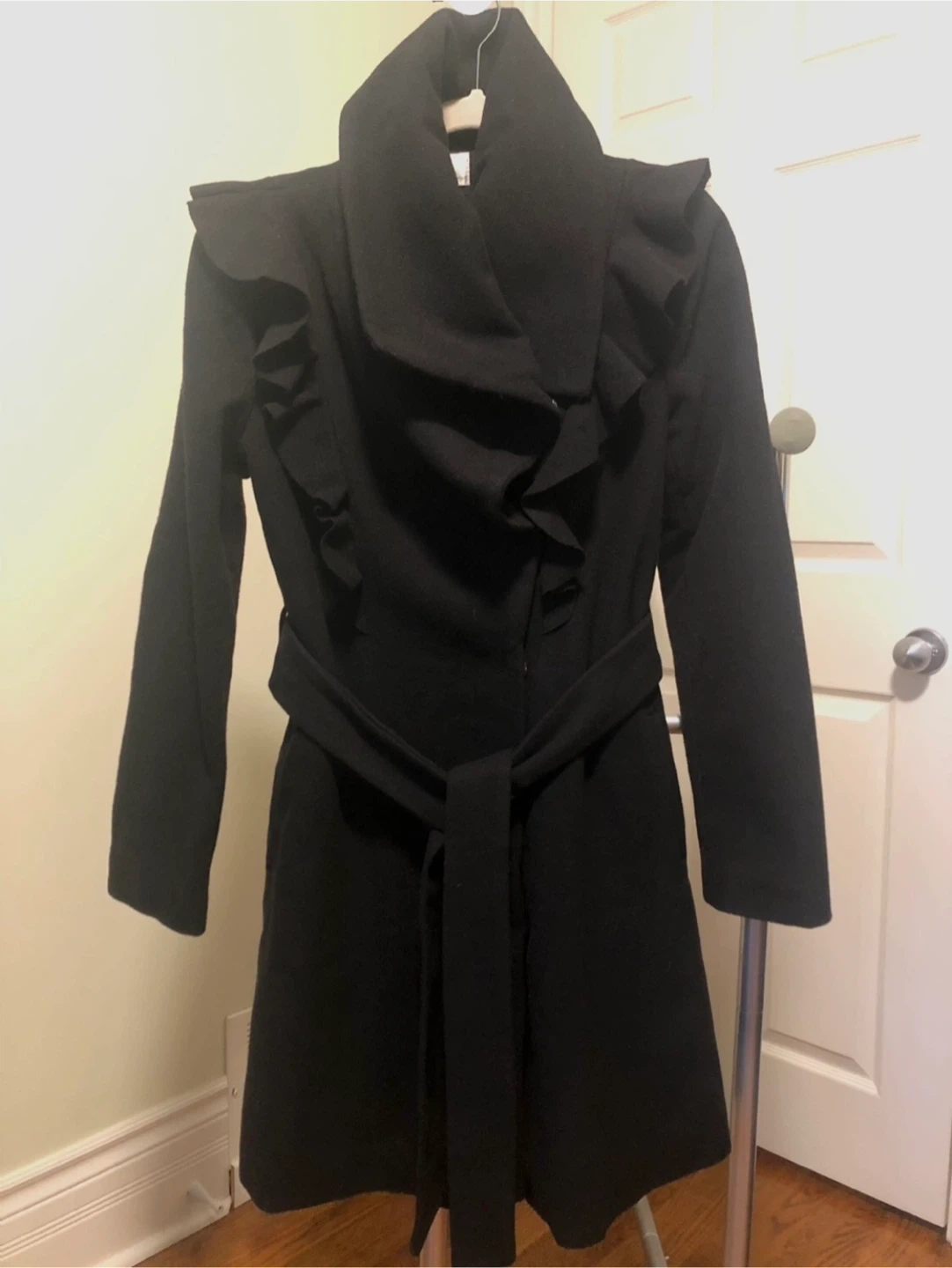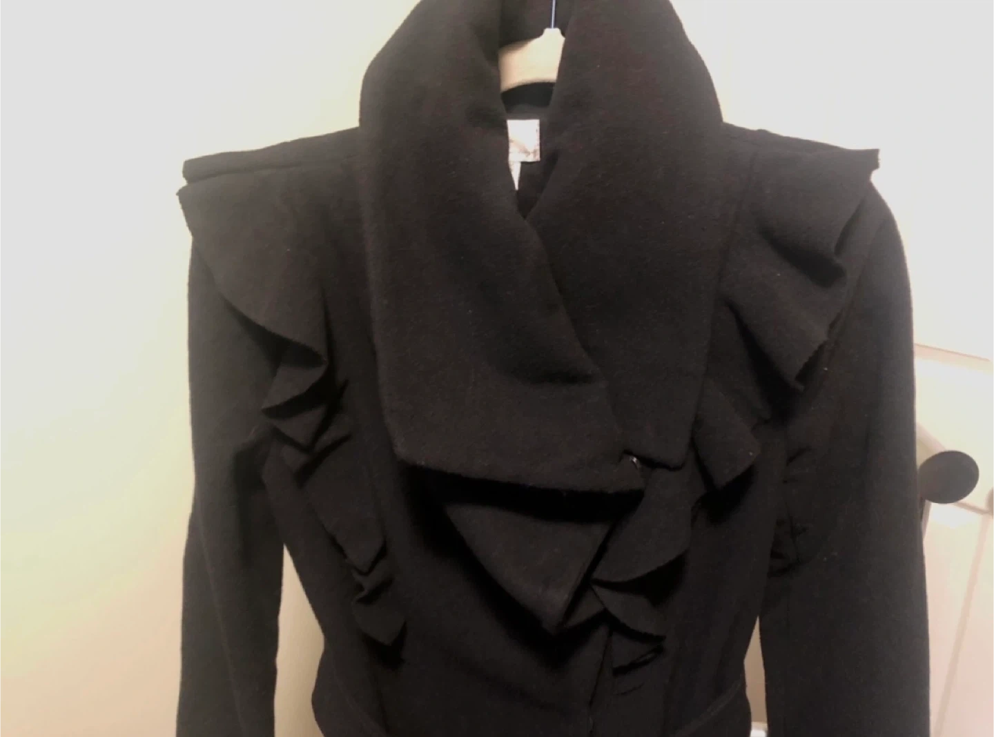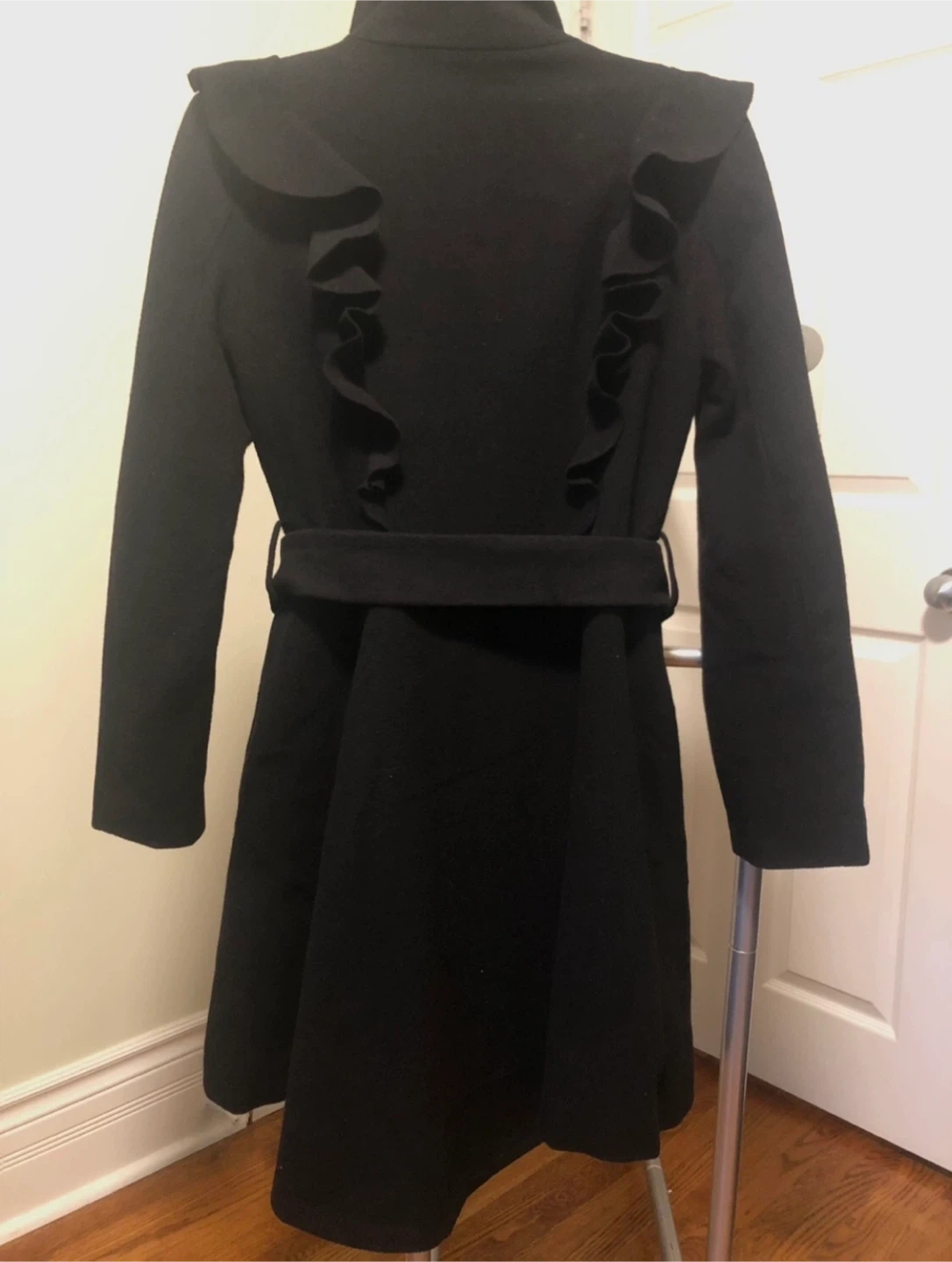 Selling a stylish black coat with unique ruffle details! It has a flattering belted waist and a dramatic collar. Perfect for adding a touch of elegance to any outfit.