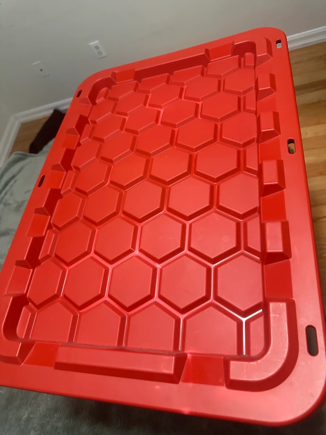 Selling a large storage container! It has a vibrant red lid and a sturdy black base. Perfect for organizing your belongings in the garage, basement, or anywhere you need extra storage