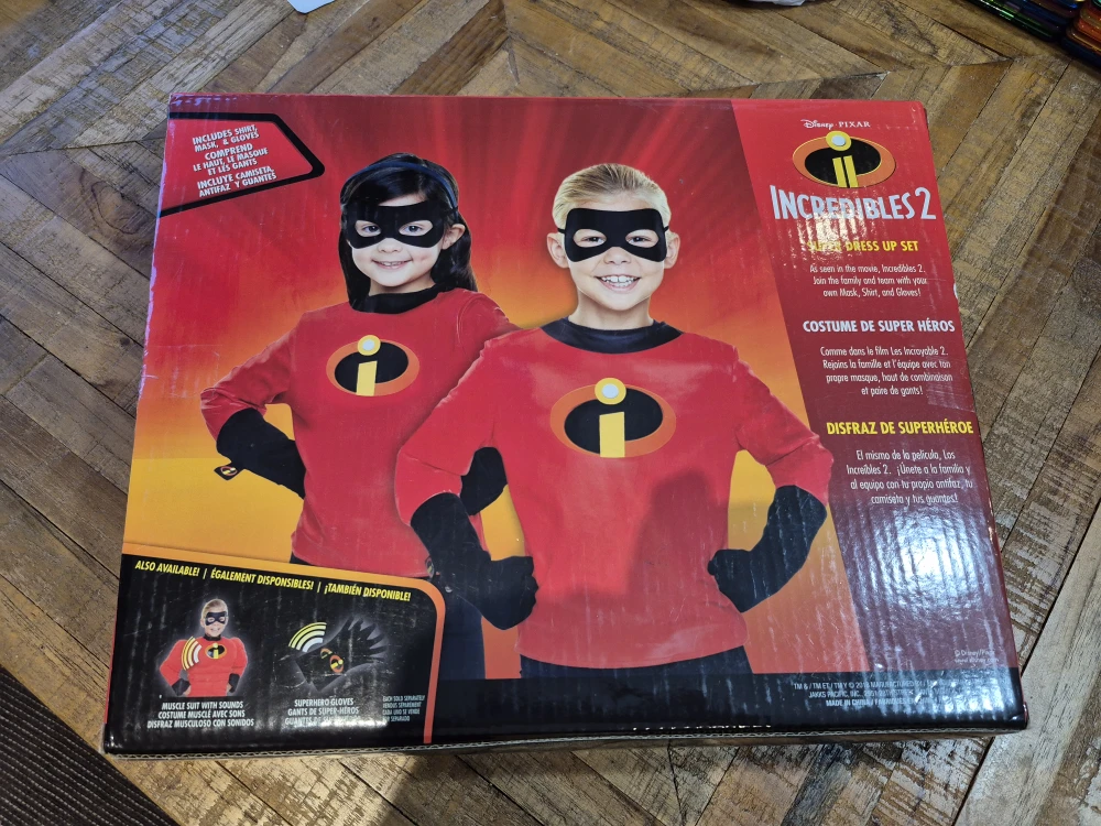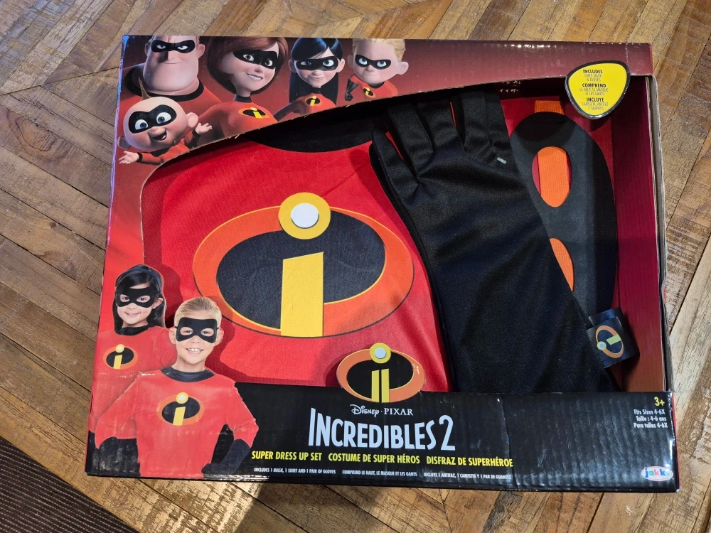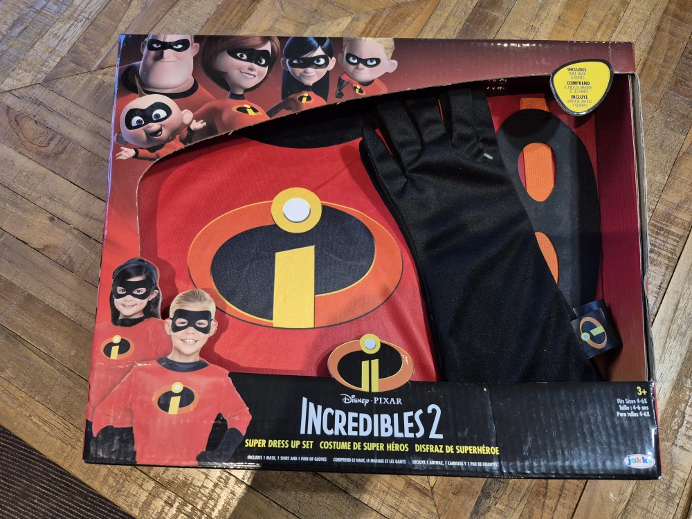 Selling an Incredibles 2 Super Dress Up Set. It includes a mask, shirt, and pair of gloves. The size is for ages 3+ and fits sizes 4-6.