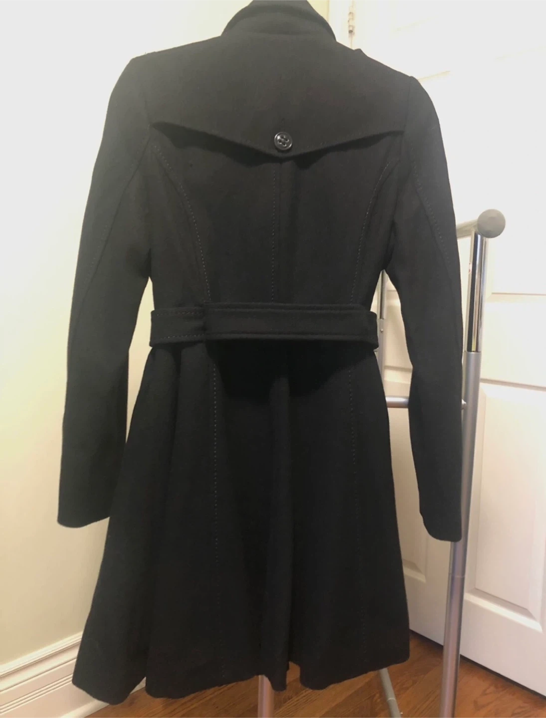 Selling a stylish black coat from H&M! It's a women's size 8. The coat features a double-breasted design with a belt.