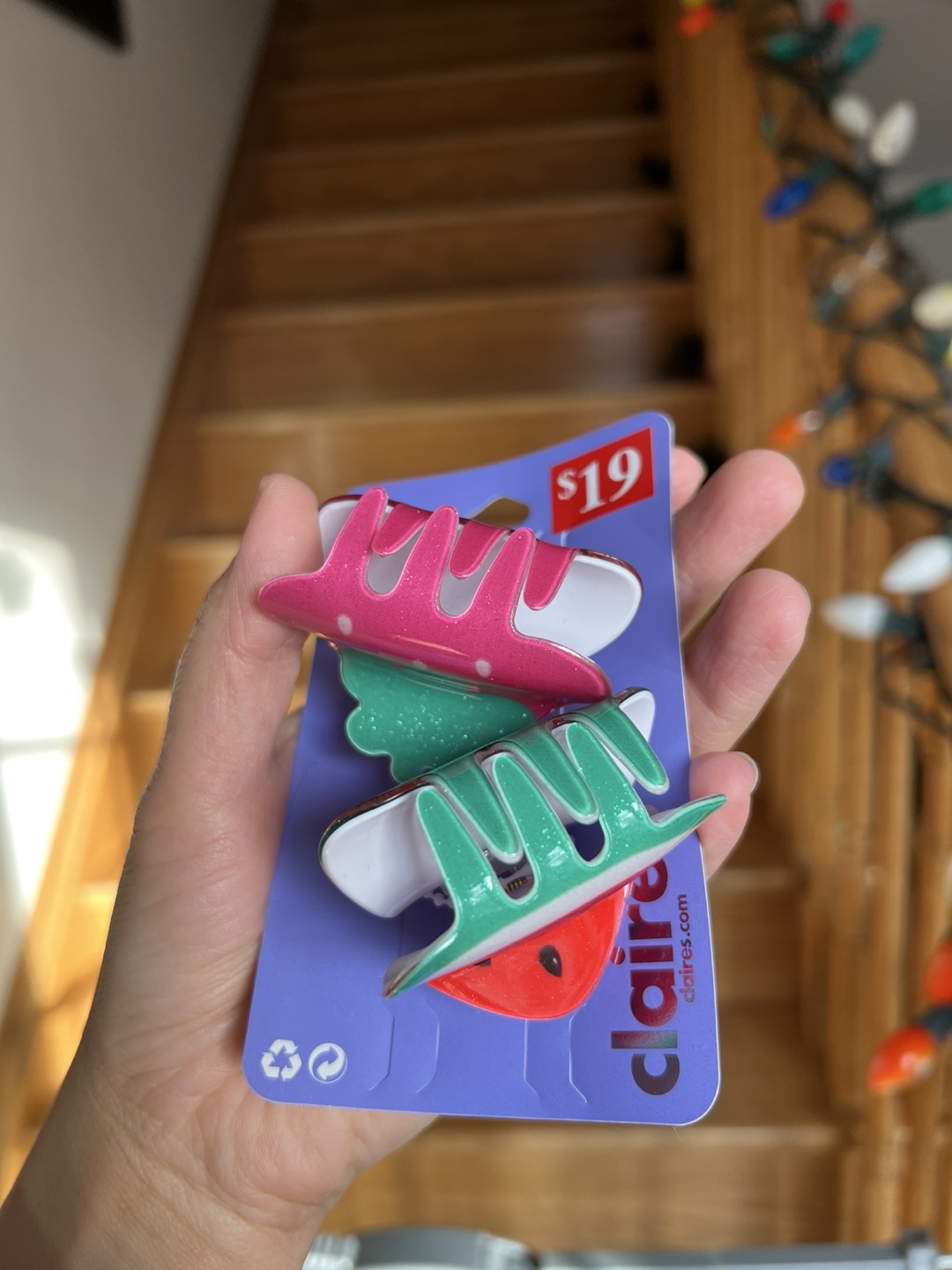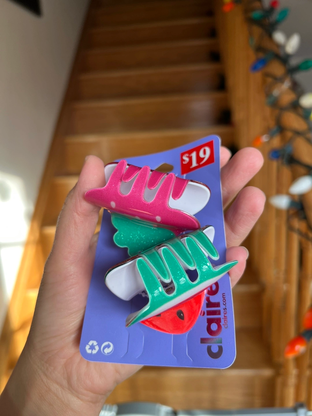 These adorable Claire's hair claw clips are brand new and still on the card! One clip is pink with white polka dots, and the other is green with a watermelon design. They are super cute for summer! Originally priced at $19
