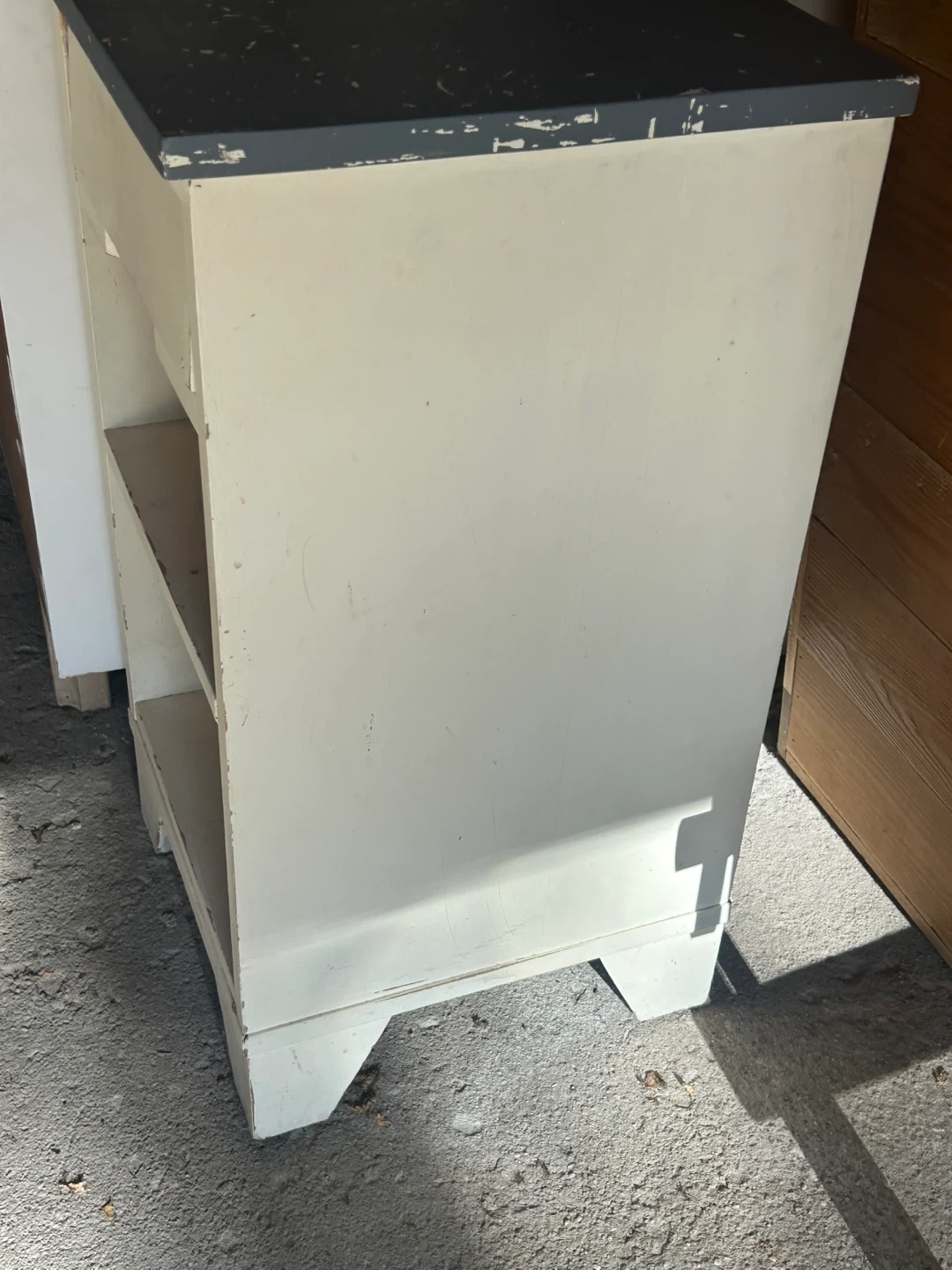 Selling a cute little side table! It features a drawer and two open shelves, perfect for bedside storage or as a small bookshelf. The table is painted in a creamy off-white with a darker top. It has a charming, rustic look.