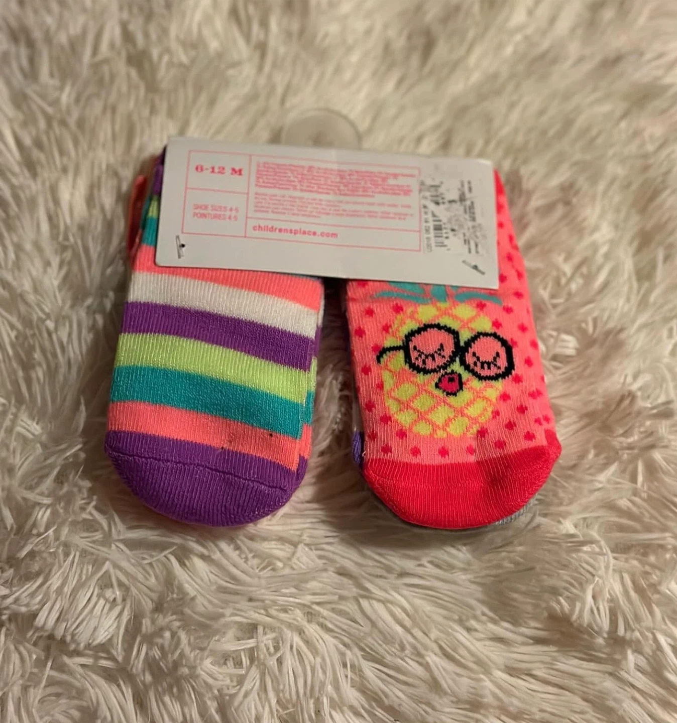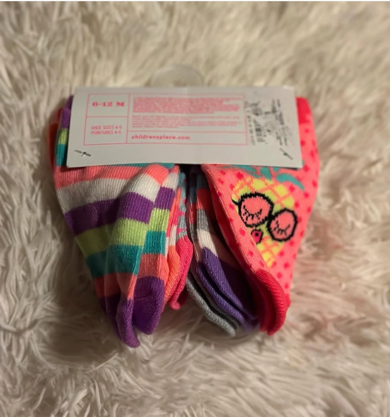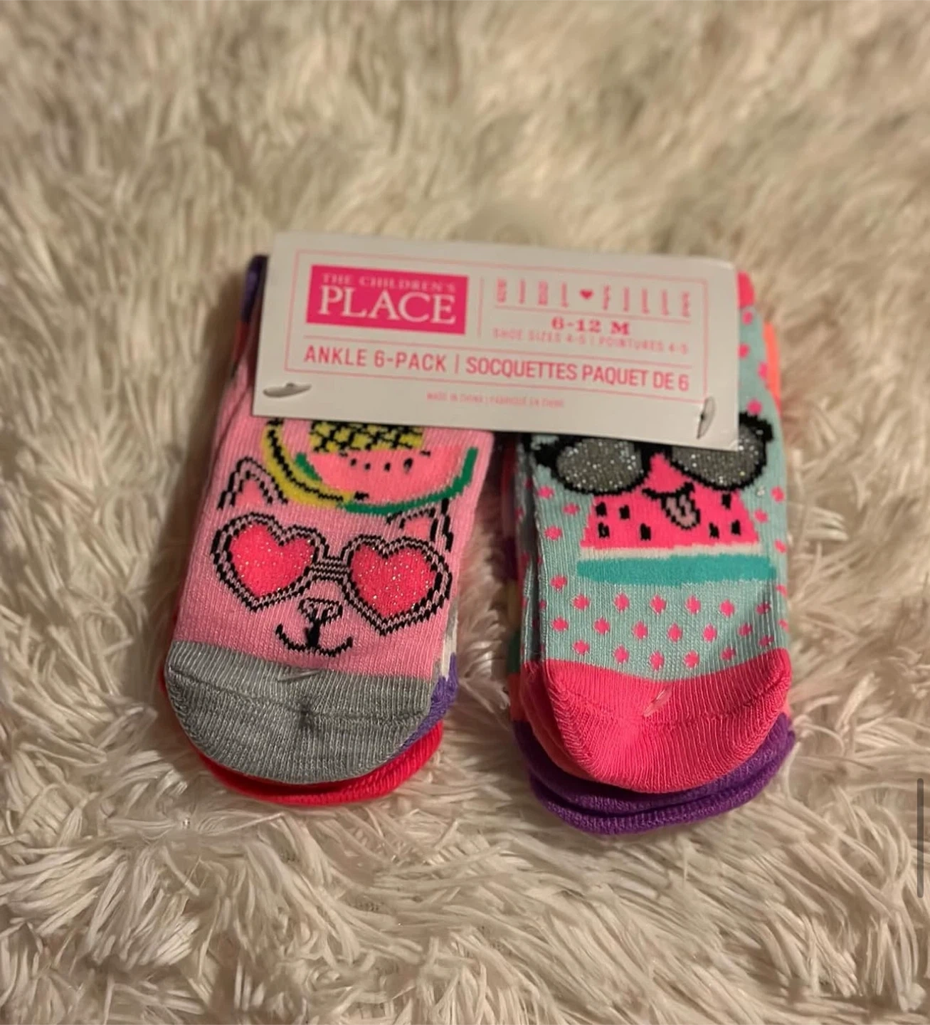 These adorable ankle socks from The Children's Place are brand new and ready for your little one! This is a 6-pack of socks, sized 6-12 months. They feature cute designs like cats, watermelons, and pineapples with sunglasses. Super cute!