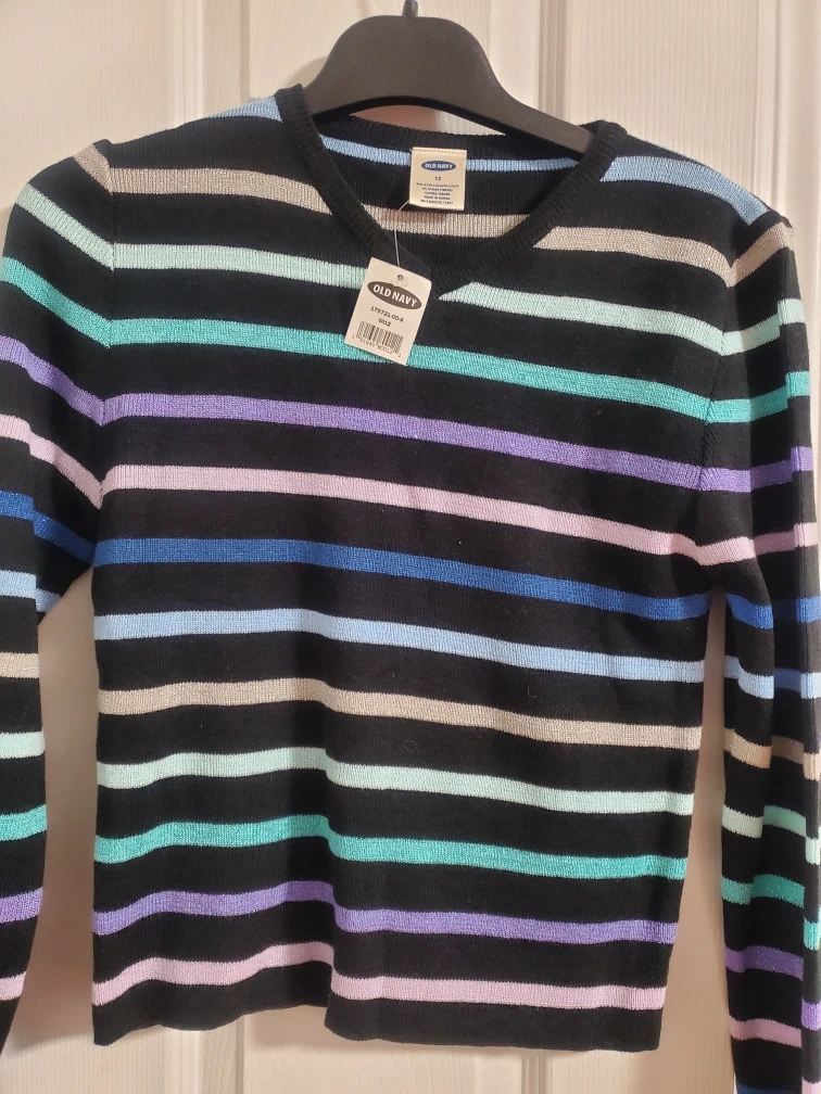 Selling a cute Old Navy striped sweater! It's a size 12 and features a colourful striped pattern on a black background. Perfect for adding a pop of colour to your wardrobe