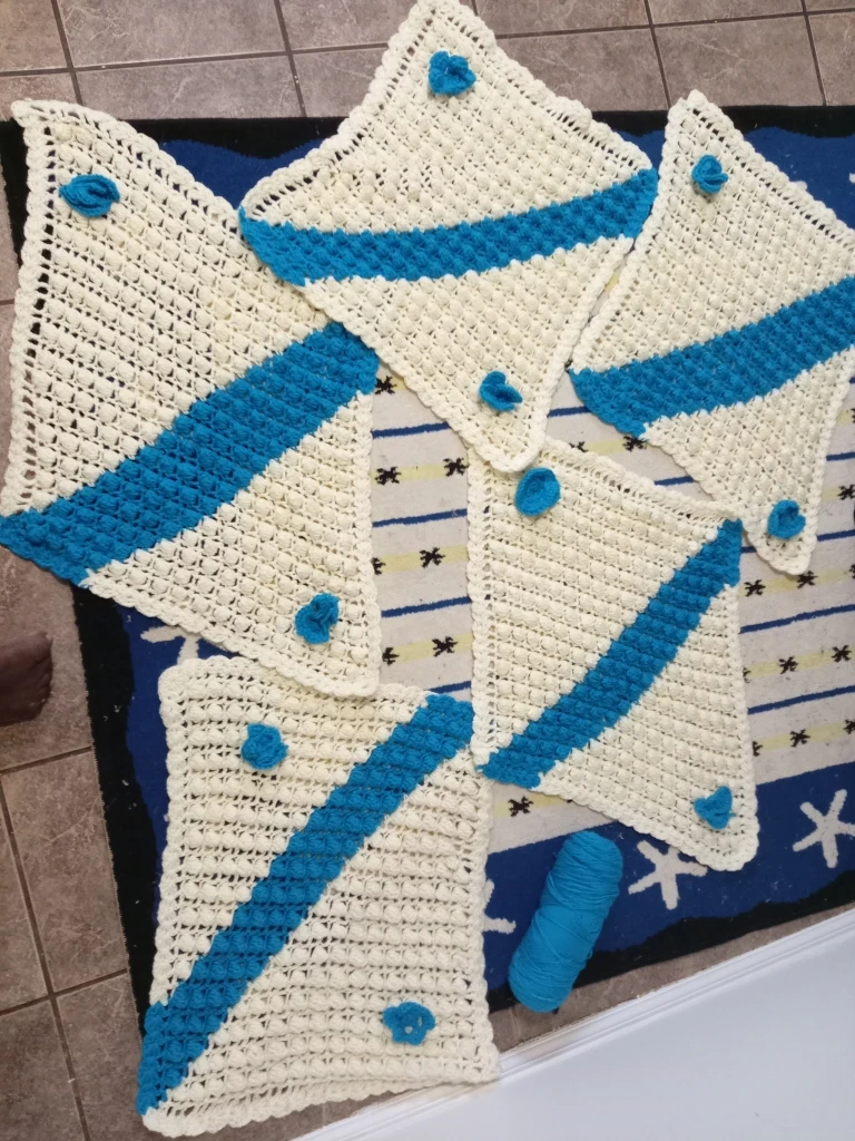 Selling a set of 5 handmade crochet potholders. They're cream coloured with a blue stripe and little blue flower details. Perfect for adding a touch of handmade charm to your kitchen!