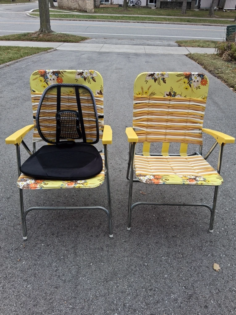 Selling a set of two vintage folding lawn chairs. They have a lovely floral pattern on a yellow background. One chair has a black back support attached. Great for adding a retro touch to your backyard or patio!