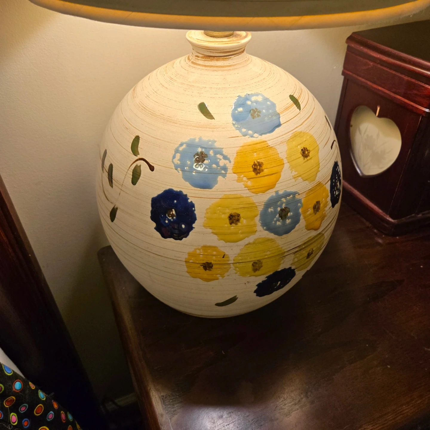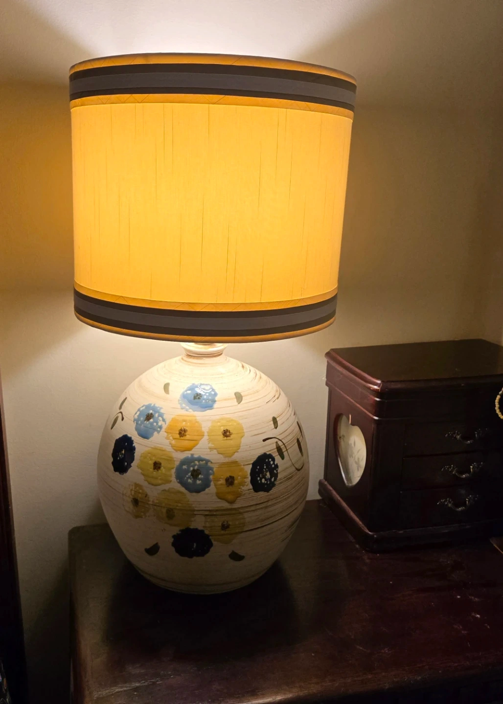 This gorgeous Vintage MCM Italian ceramic table lamp with a muted floral design! It would be a great addition to any room and adds a touch of warmth with its soft light