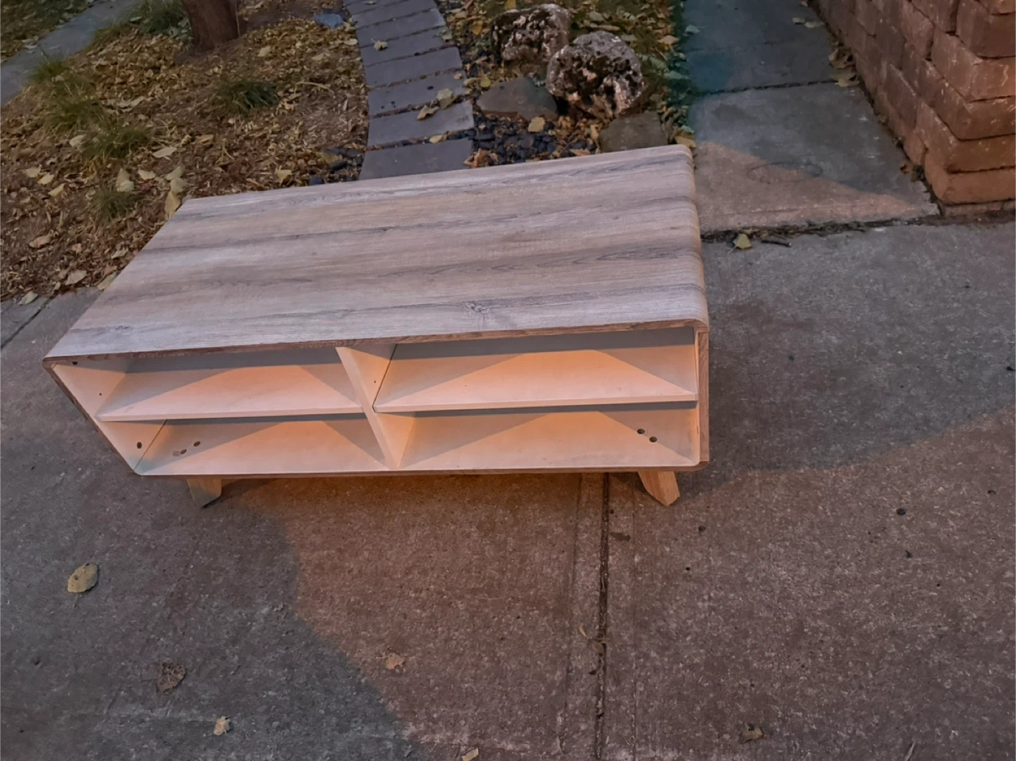 Selling a wooden storage shelf unit. It has a light wood grain finish and features four compartments for storage. Perfect for organizing books, toys, or other items in your home!