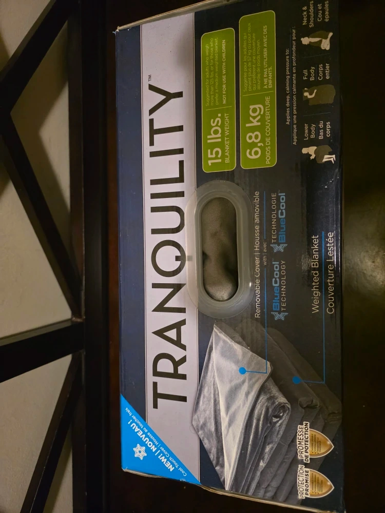 I'm selling a brand new Tranquility weighted blanket still in its original packaging! It's a 15 lbs (6.8 kg) blanket, perfect for adding deep calming pressure and helping you relax. The cover is washable and has an antimicrobial treatment to control odours. It measures 48 inches by 72 inches (121 cm x 182 cm).