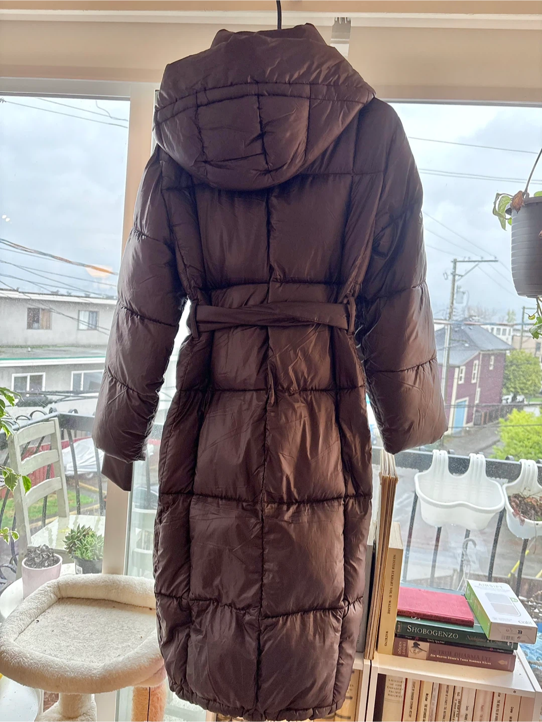 Long puffer coat with a hood. Has pockets and a belt.