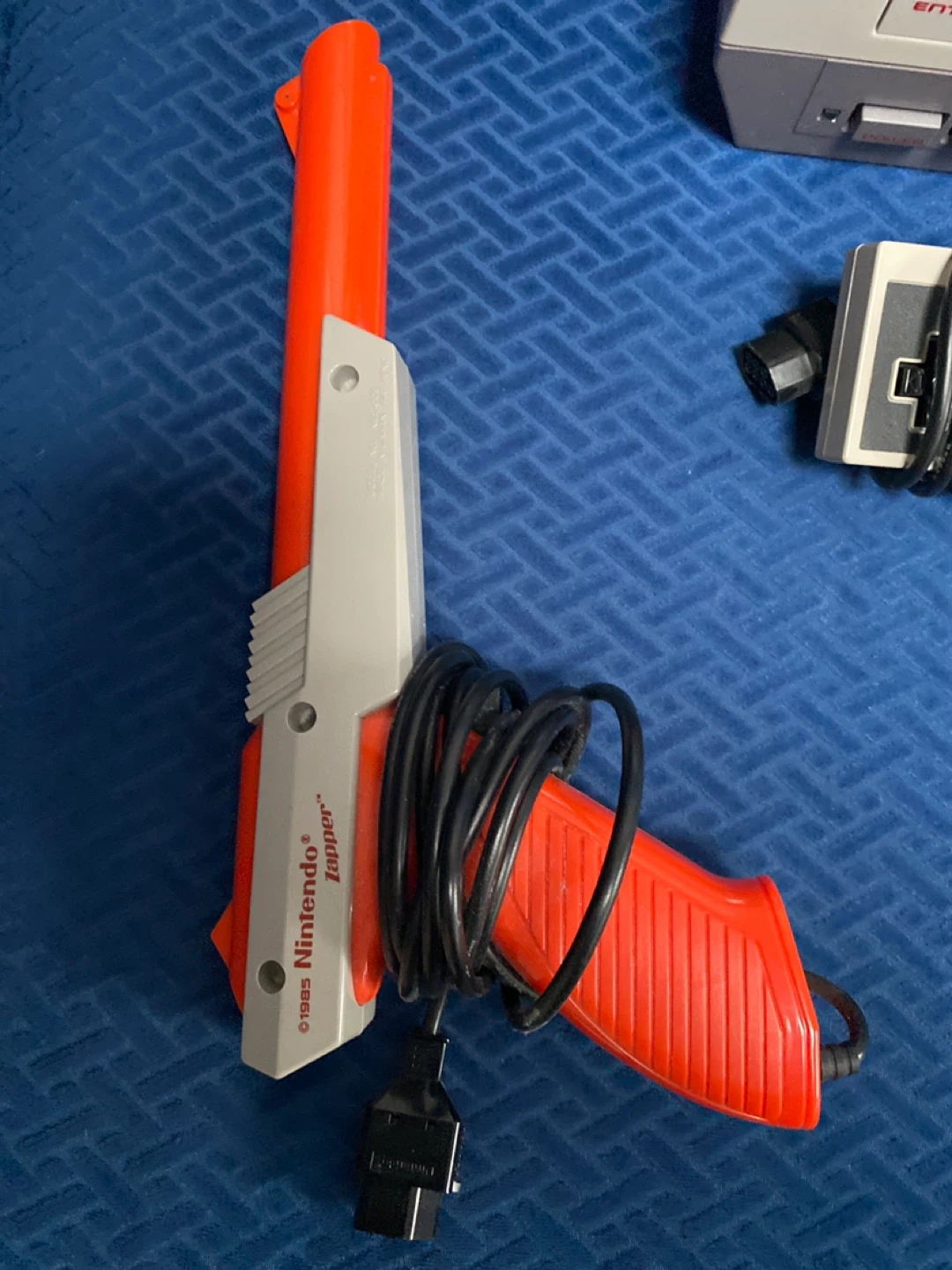 Selling a Nintendo Entertainment System (NES) bundle! It comes with the console, two controllers, and the zapper light gun. Also included are the following games: