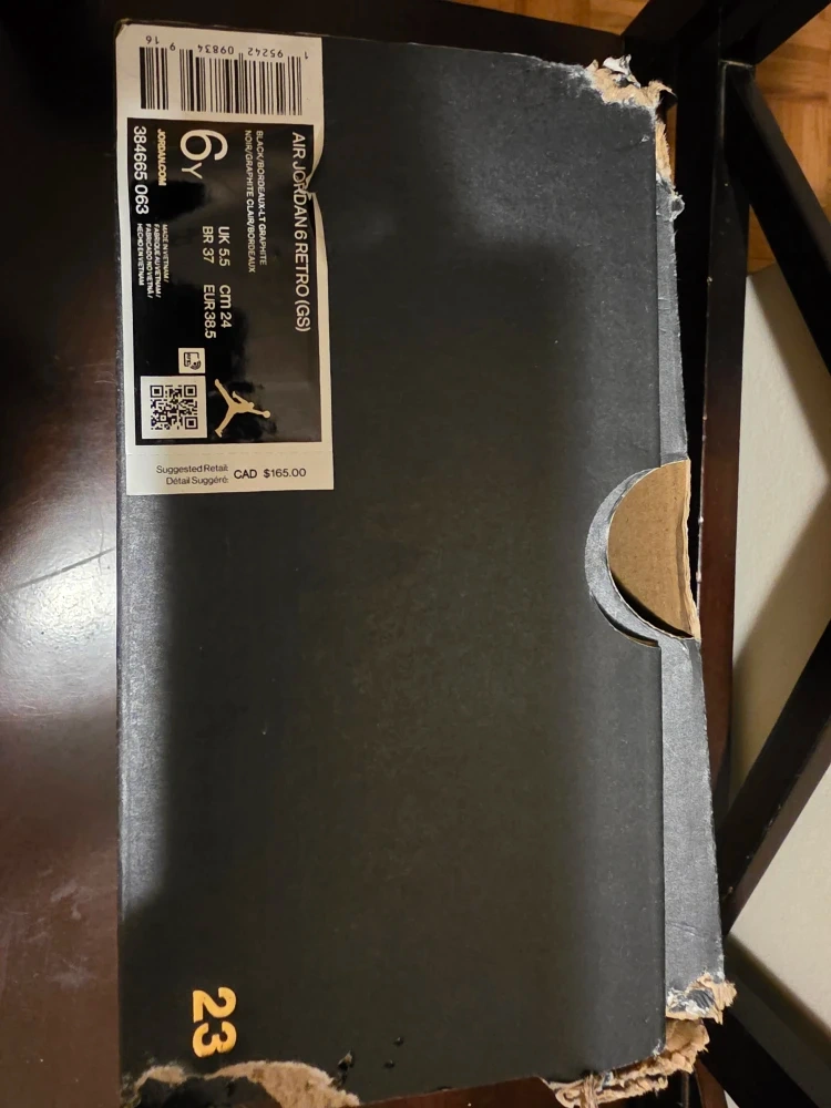 Selling a pair of Air Jordan 6 Retro (GS) in black and graphite. They are size 6Y and come with the original box. Suggested retail price was CAD $165.00. Perfect for any young sneakerhead!