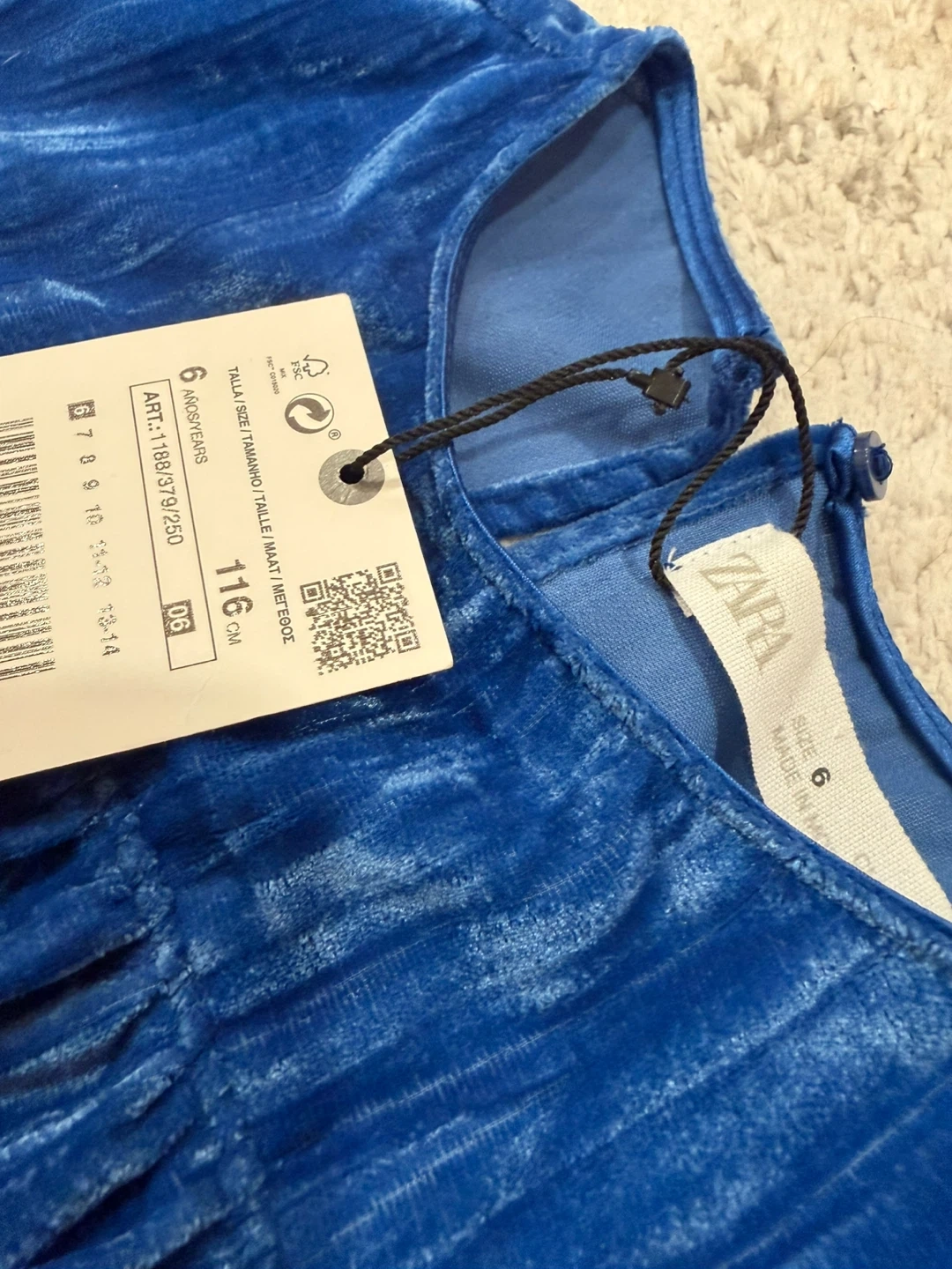 This is a new Zara dress, size 6! It's a beautiful blue velvet material. The tag is still attached, and it was originally $29.90! Perfect for the holidays!