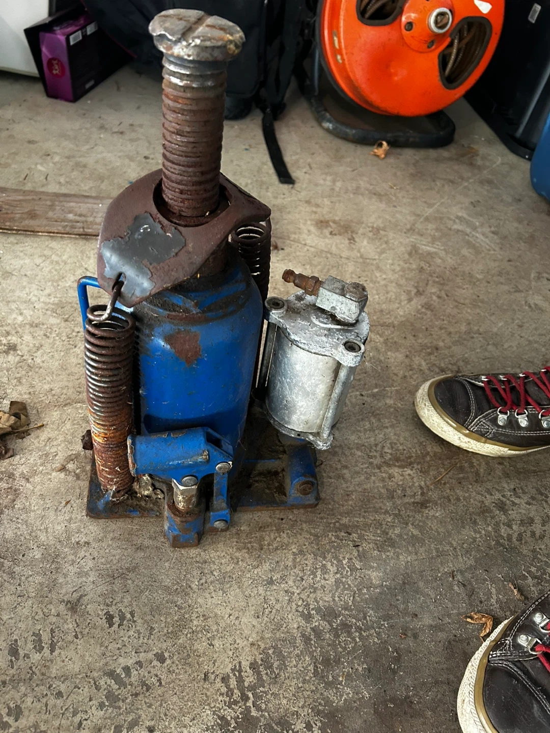 Selling a hydraulic bottle jack. Shows signs of wear and rust, but still functional for lifting heavy objects. Please see photos for condition